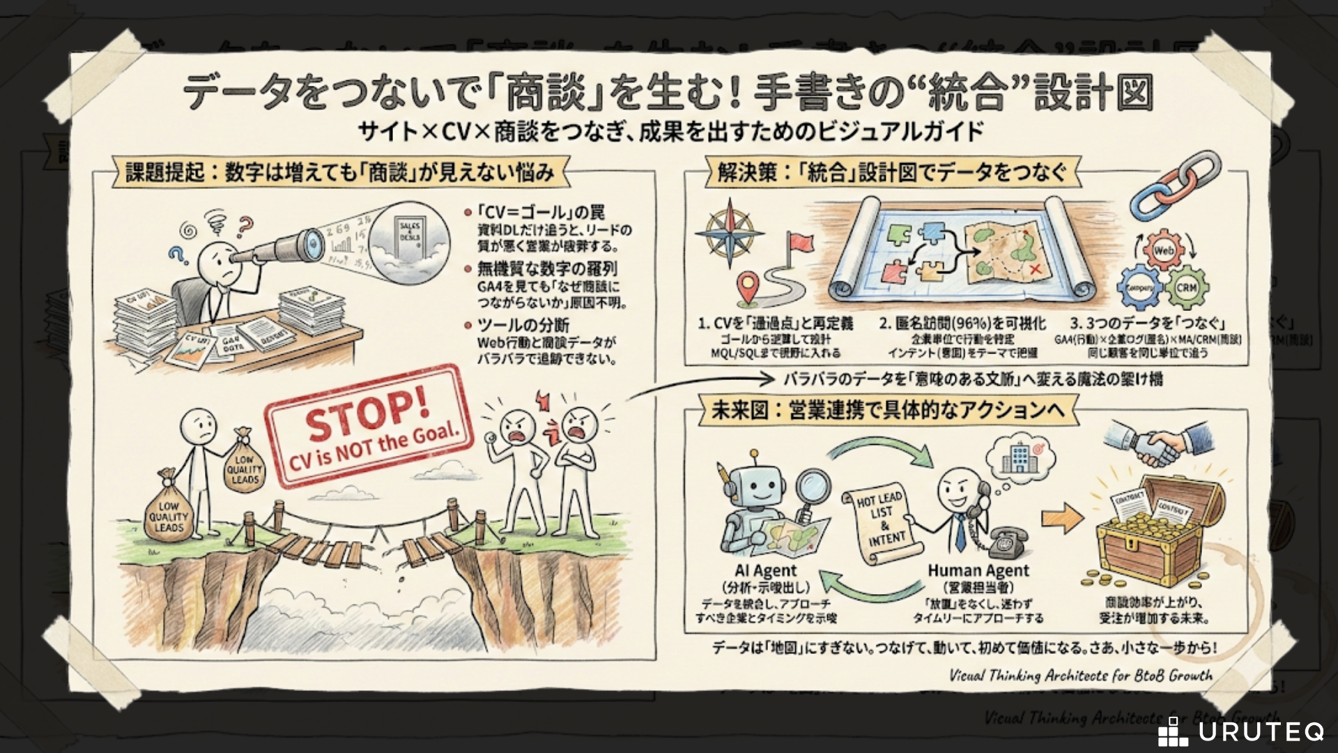 結局、その四半期の商談数は目標を大きく下回りました。マーケティングチームは「数は集めた」と主張し、セールスチームは「質が悪すぎる」と反論する。この分断を生んだ原因は、分析と目標設定の視野が「リード獲得(CV)」で止まっていたことにあります。