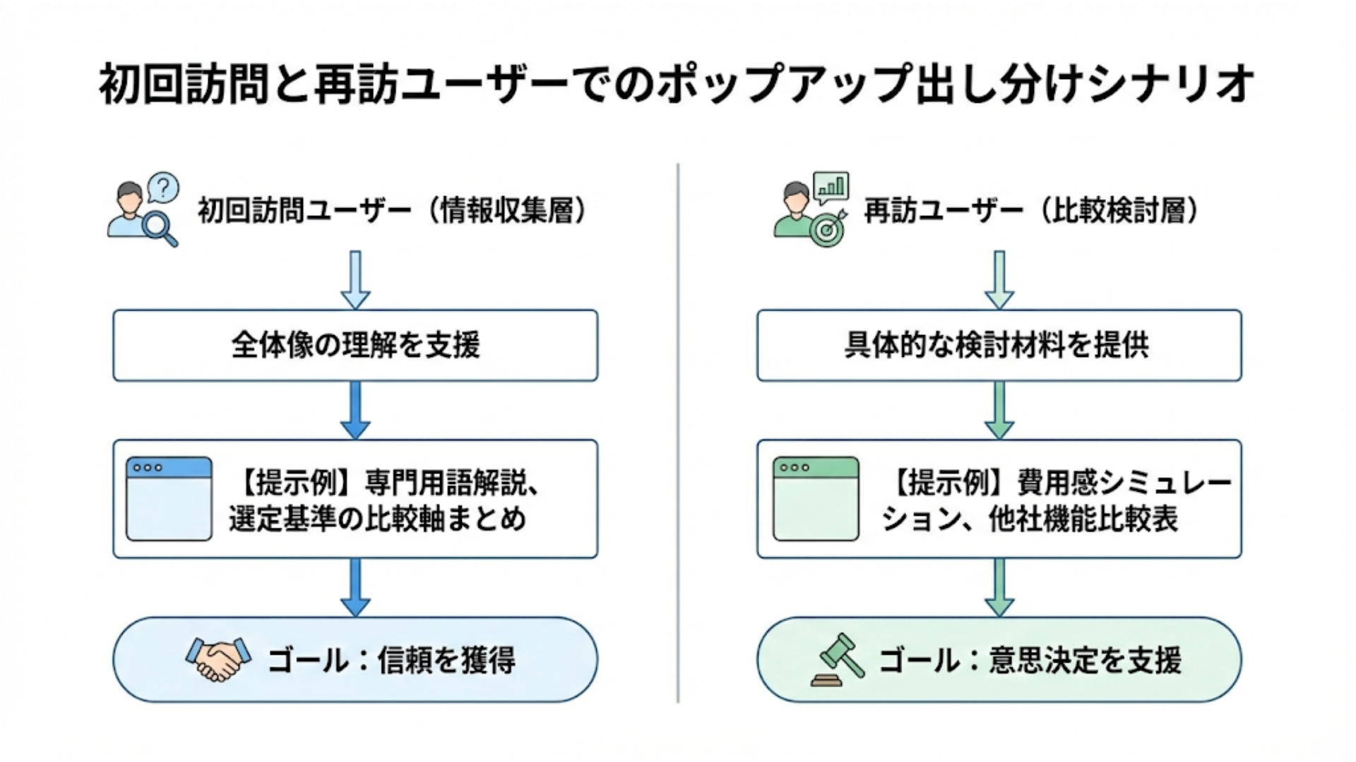 初回訪問のユーザーには、まずはその領域の全体像を理解してもらうための軽い支援が適しています。例えば、専門用語の解説や、ツールを選定する際の基準をまとめた比較軸の提示などです。ここでは信頼を獲得することに主眼を置きます。