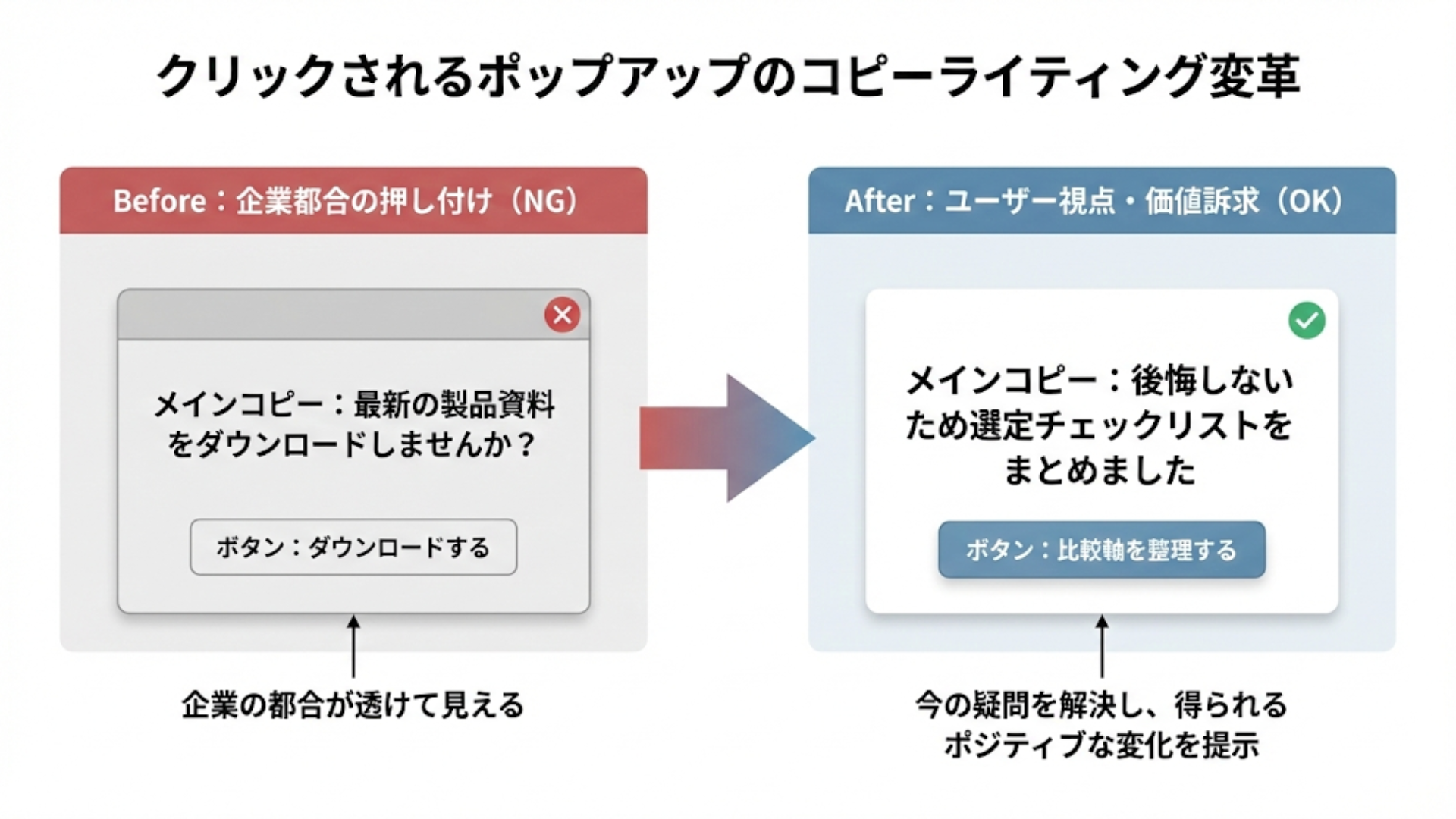 条件設定が完璧でも、表示される文言が魅力的でなければクリックはされません。ポップアップ内のコピーライティングは、ユーザーが抱いている今の疑問を言語化し、解決を約束するものである必要があります。