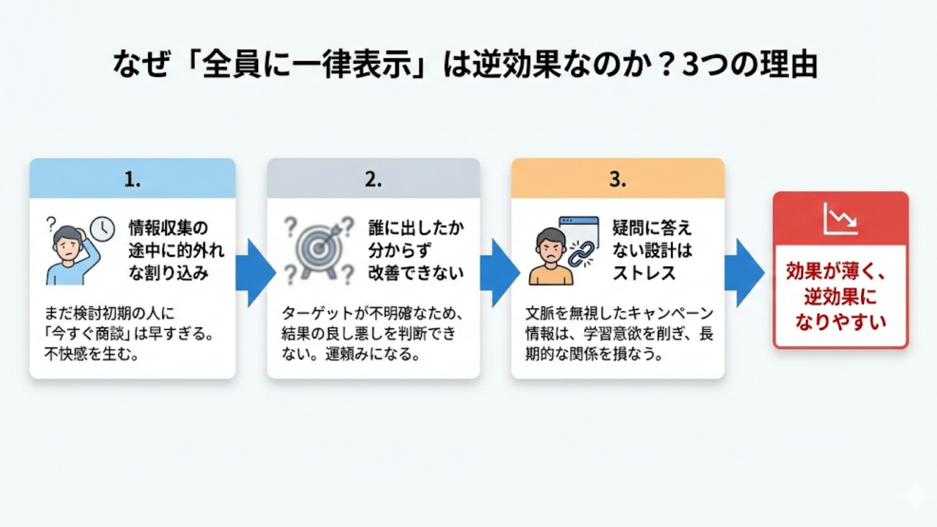 多くの担当者が、とりあえず何か出しておけば反応があるだろうと全員に出す設計をしてしまい、結果としてユーザーに邪魔だと思われ、無視されるだけでなくブランド体験を損ねてしまっています。せっかく質の高いコンテンツを用意していても、的外れなタイミングでの割り込みは読者の思考を停止させてしまうのです。