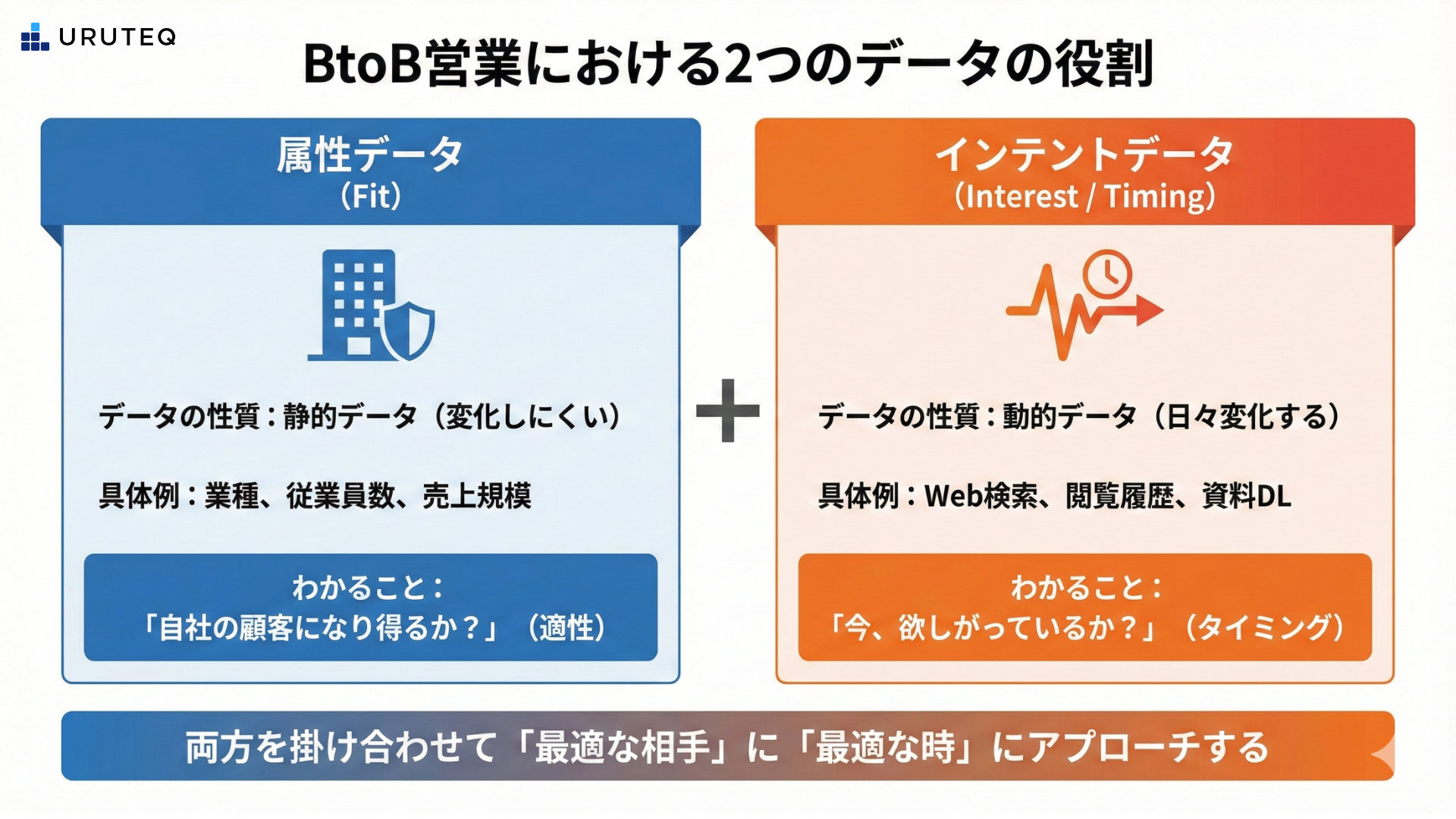これまでBtoBマーケティングで主役だったのは、企業データベースに基づく属性データでした。これとインテントデータはどう違うのでしょうか。両者の役割を整理すると、その違いが鮮明になります。