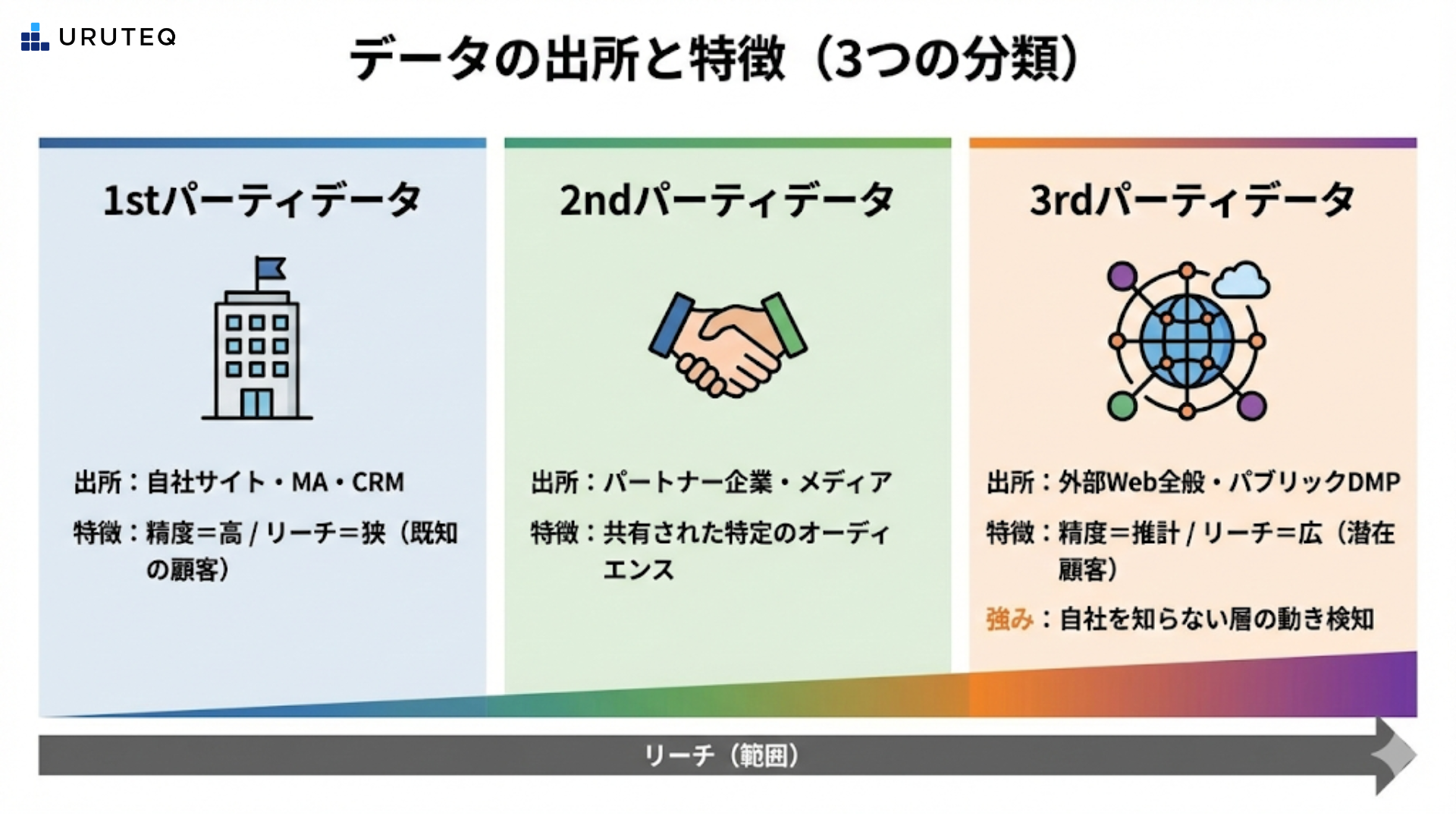 二つ目は、2ndパーティデータです。これは、パートナー企業やメディアなどが保有している1stパーティデータを、許可を得て共有してもらうものです。例えば、特定の業界メディアと提携し、そのメディアの読者データを活用させてもらうケースなどがこれに当たります。自社だけではリーチできない層の情報を得られるメリットがありますが、提携先との関係性に依存するため、いつでも自由に使えるわけではありません。