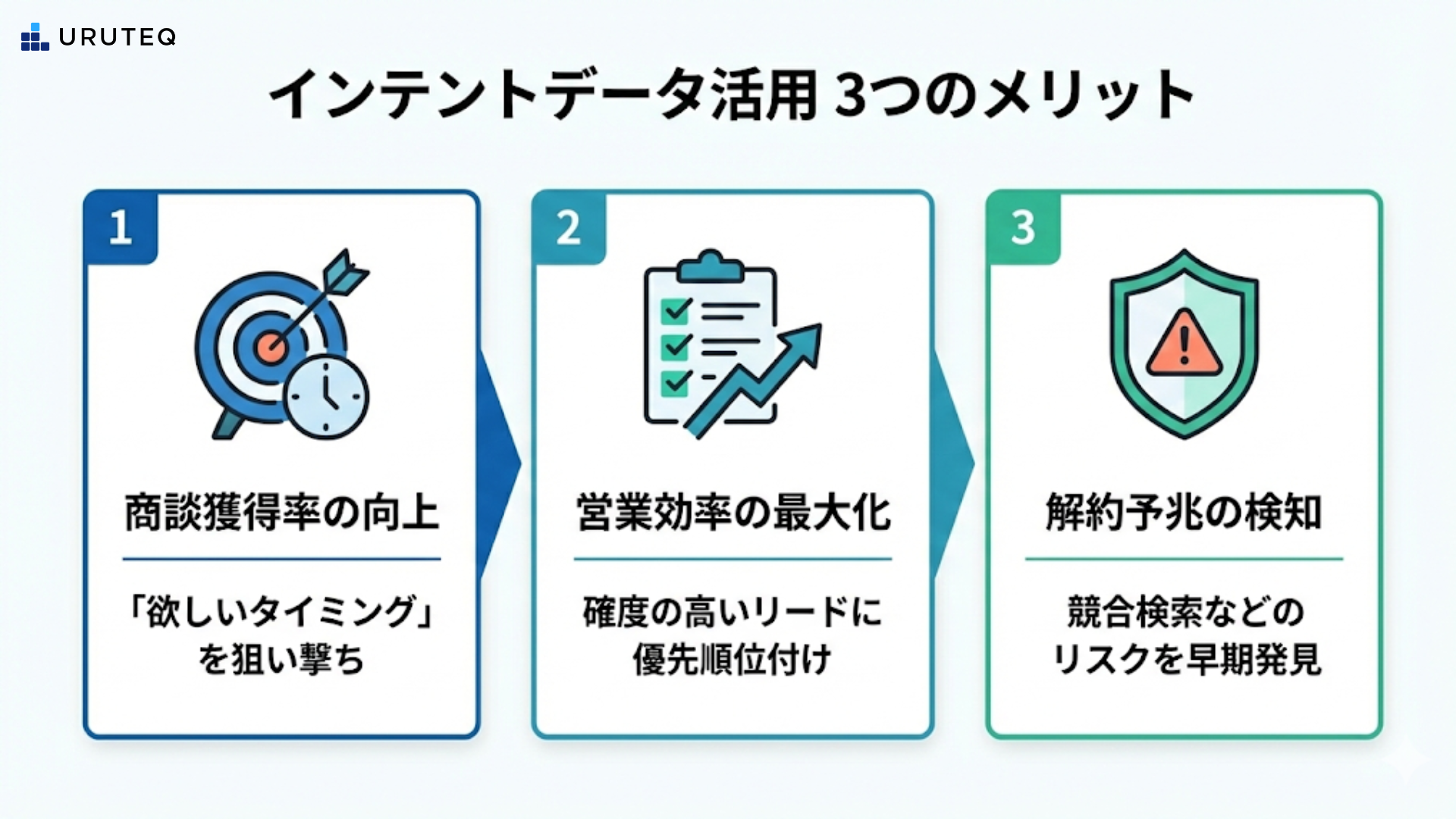 概念や必要性は理解できても、実際にビジネスの現場でどのような成果につながるのかが重要です。インテントデータを導入し、活用することで得られる具体的なメリットは、主に以下の3つに集約されます。