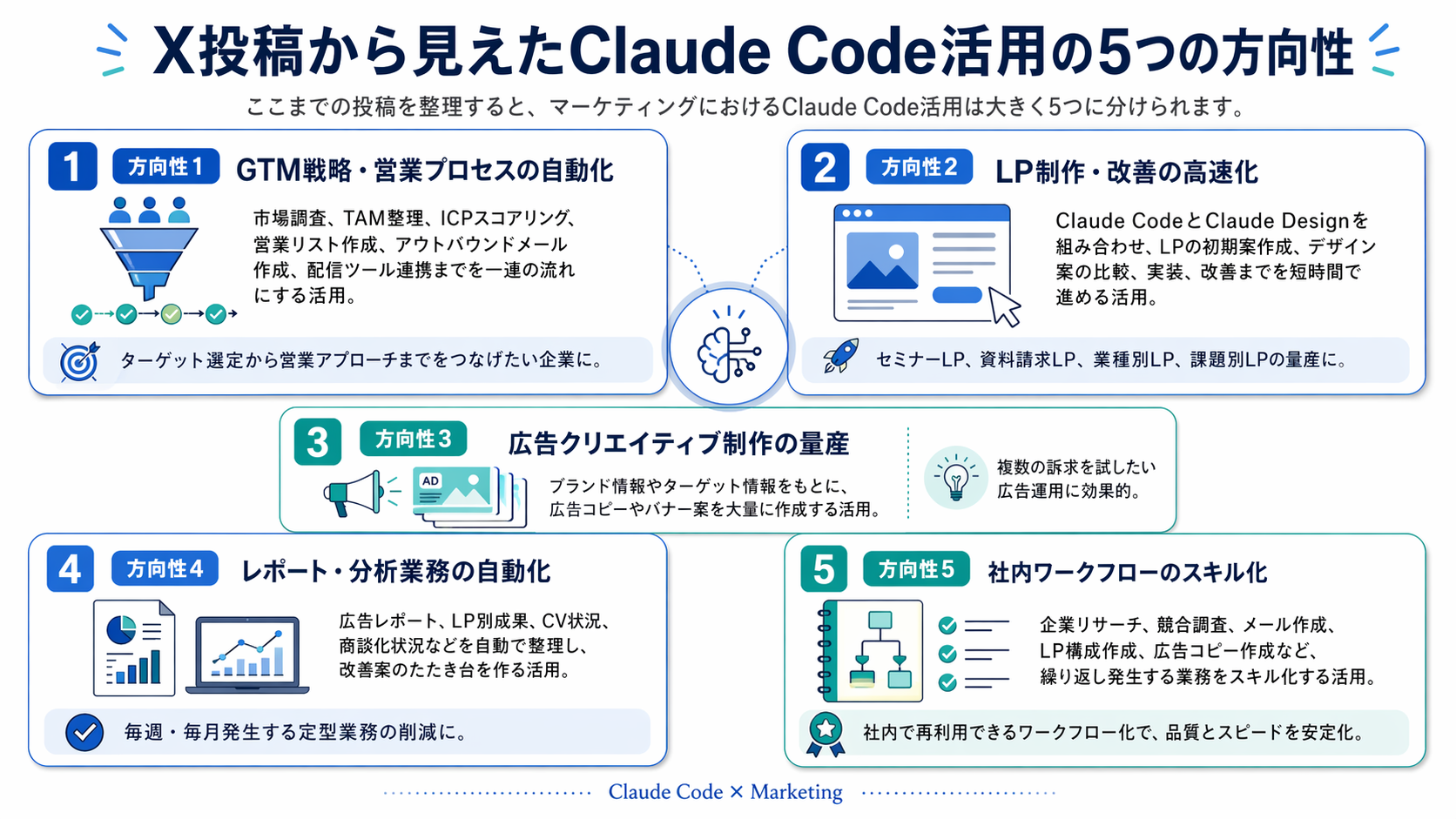 ここまでの投稿を整理すると、マーケティングにおけるClaude Code活用は大きく5つに分けられます。