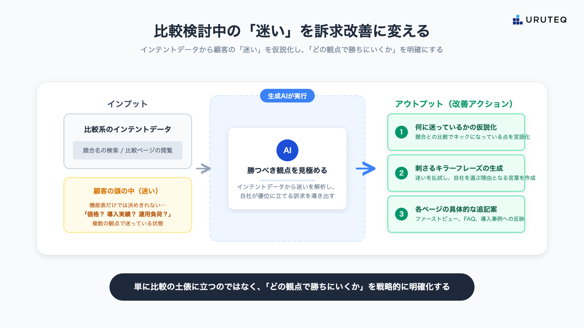 このパターンでは、比較系のインテントデータ(競合名の検索、比較ページの閲覧など)をAIに渡し、以下のアウトプットを得ます。