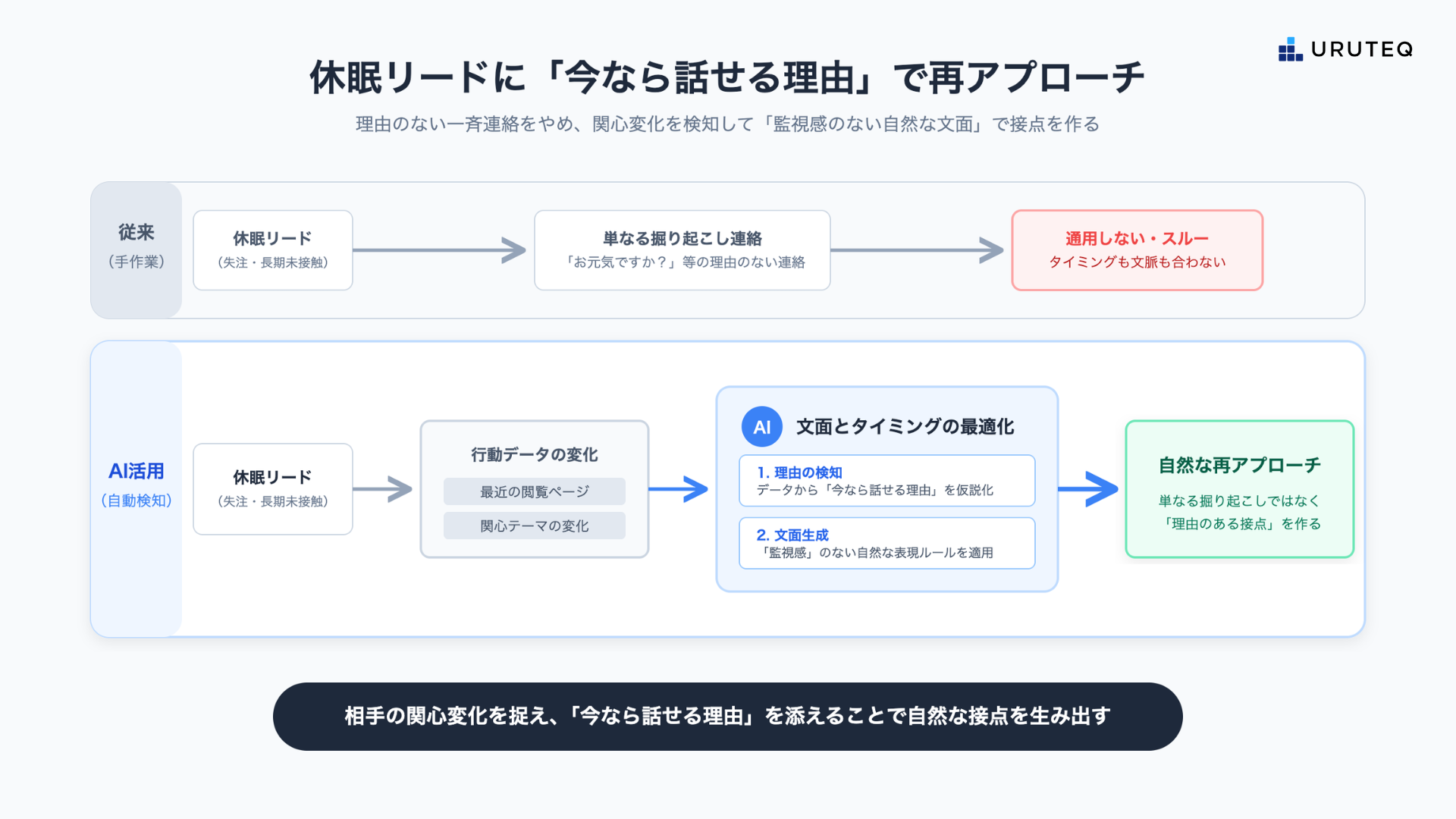 単なる掘り起こしではなく、理由のある接点づくり。相手にとっても「監視されている」と感じない表現ルールも組み込まれています。