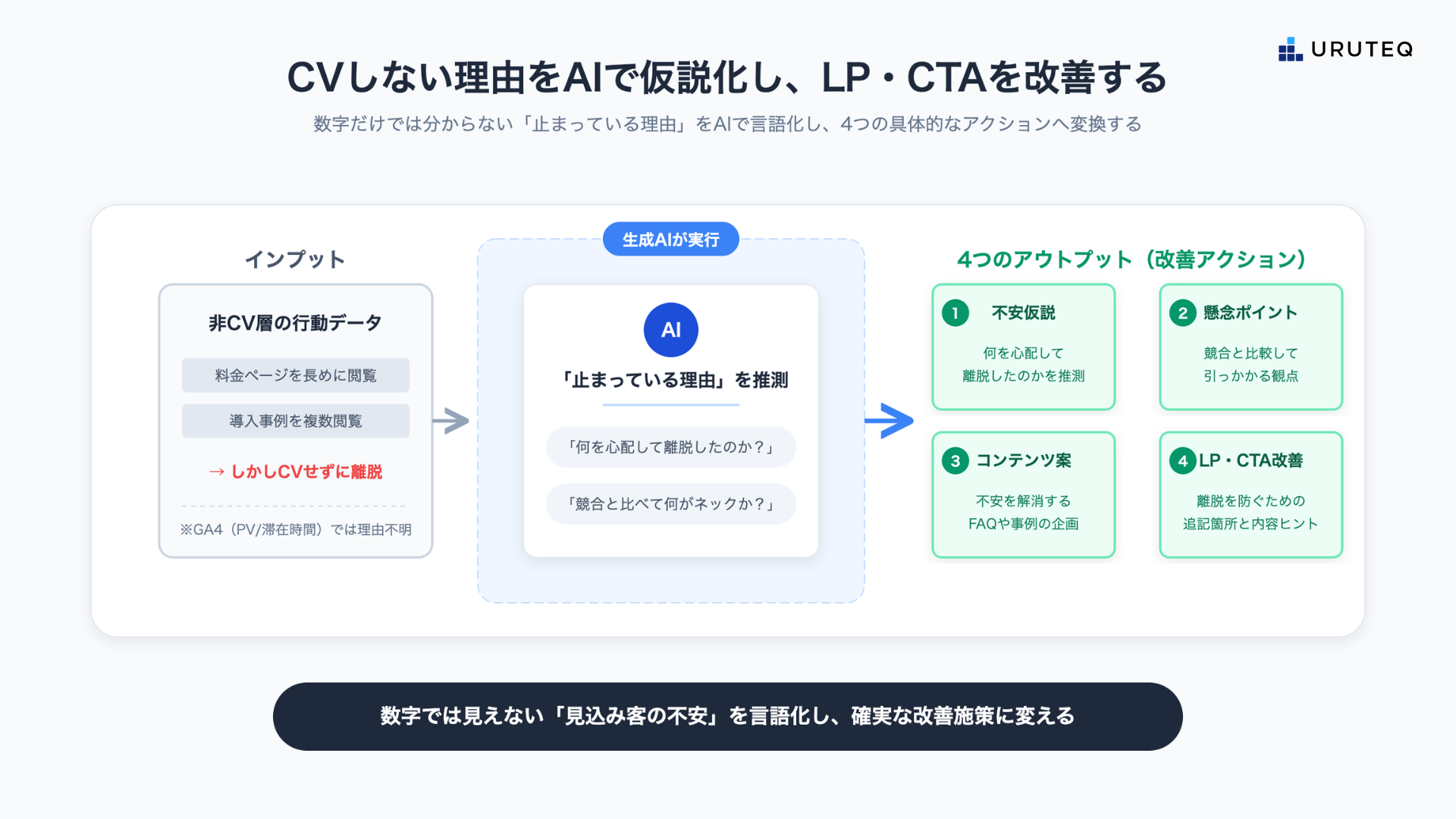 | 6 | LP・サイト改善 | 離脱理由の仮説化、コピー改善案の生成 | 非CV層の行動データ、比較検討パターン |