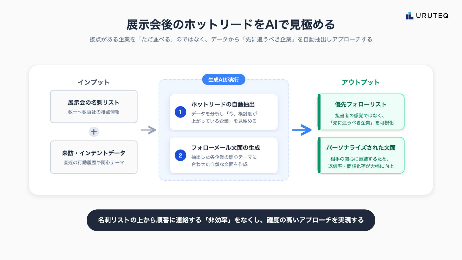 展示会やイベントの後は、名刺交換した企業リストが手元に残ります。ただ、数十〜数百社の中からどこを優先すべきかは、担当者の感覚に頼りがちです。