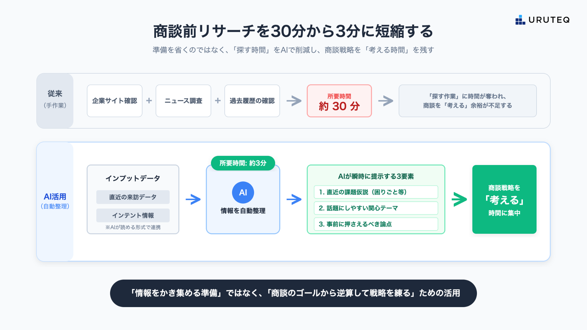 商談前の企業調査は重要です。でも、企業サイトを見て、ニュースを調べて、過去のやり取りを確認して――毎回しっかりやると30分はかかります。