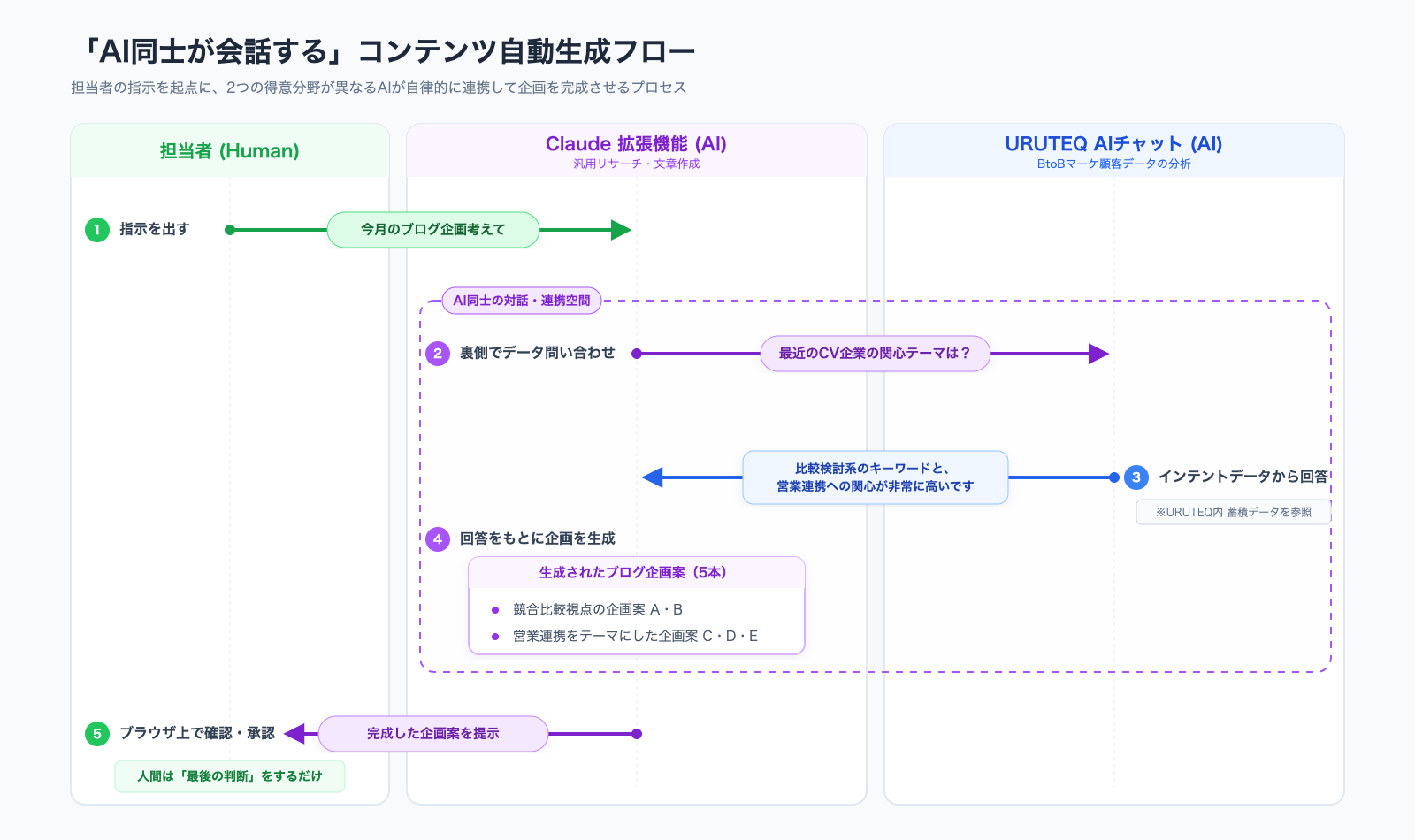キーワードは「AI同士の連携」。URUTEQのAI(顧客データに特化)とClaudeのAI(汎用的な推論・分析)が役割分担しながら動くことで、マーケ担当者は「指示を出す → 結果を確認する」だけの状態に近づきます。