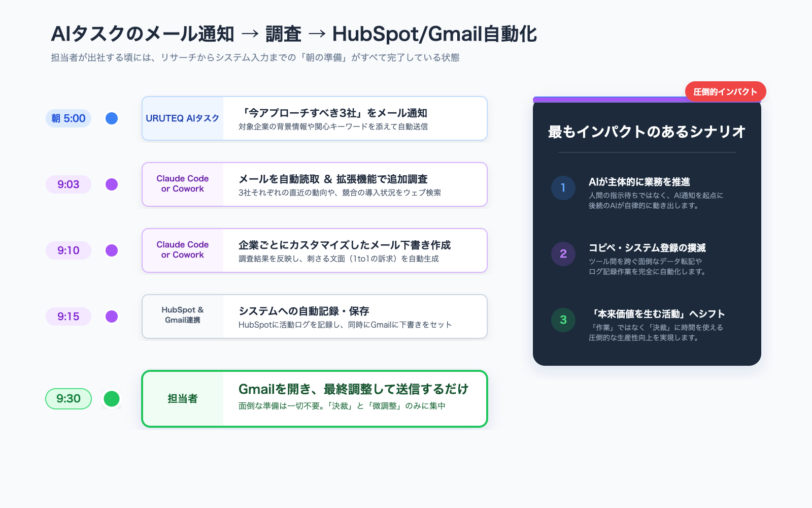 これが最もインパクトのあるシナリオです。URUTEQのAIタスクが送ってくるアプローチ候補のメールを起点に、Claude Codeが企業調査、資料準備、メール下書き作成までを一気通貫で進める流れです。