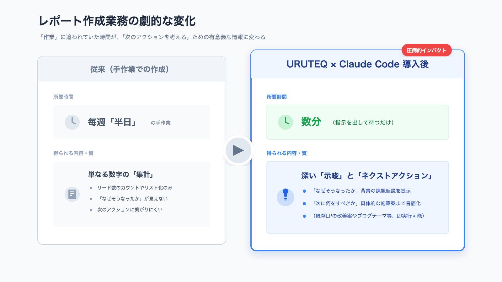 URUTEQだけでも、Claude Codeだけでも、それぞれ単体で価値はあります。ただ、両者を組み合わせると、こんな違いが生まれます。