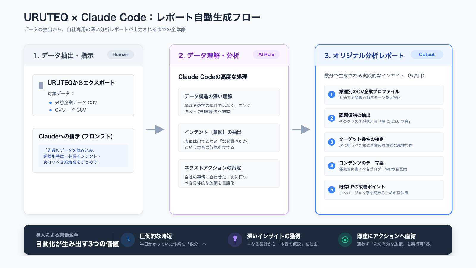 URUTEQのデータをClaudeが解釈し、顧客固有の示唆を生成 |