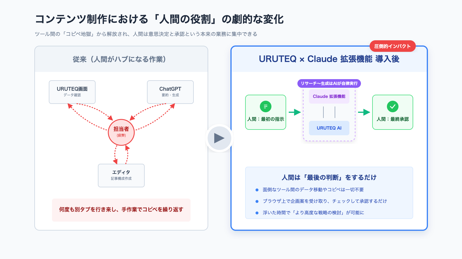 従来は担当者がURUTEQのダッシュボードを眺めて、別タブでChatGPTに要約を投げて、さらに別タブで記事構成を考えて…と何度もコピペしていました。このムダがなくなります。