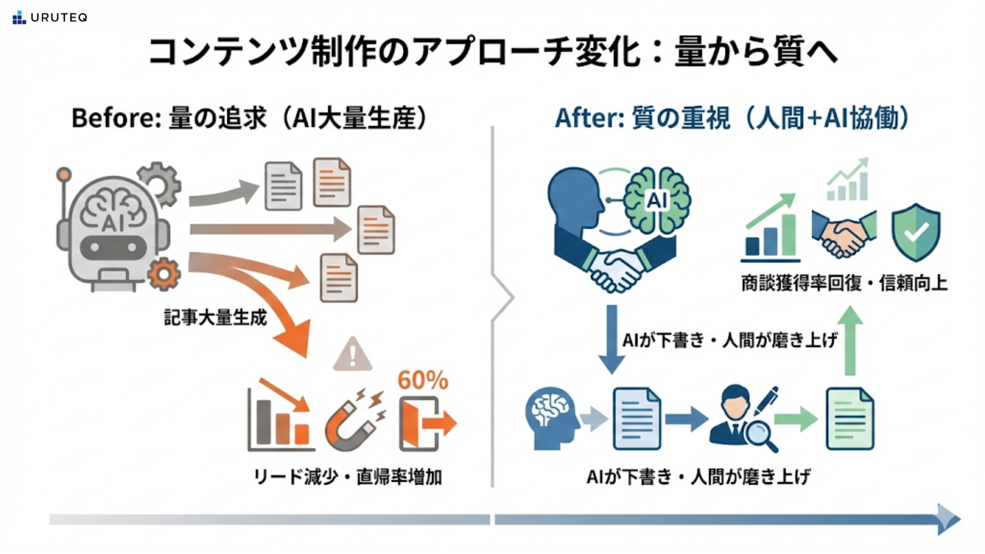 現在、この企業では、AIをリサーチや初稿作成の補助に限定し、最終的なメッセージの磨き上げには必ず人間のエキスパートが介入する体制に改めています。結果として、投稿本数は以前の半分に抑えつつも、商談獲得率は過去最高水準まで回復しました。