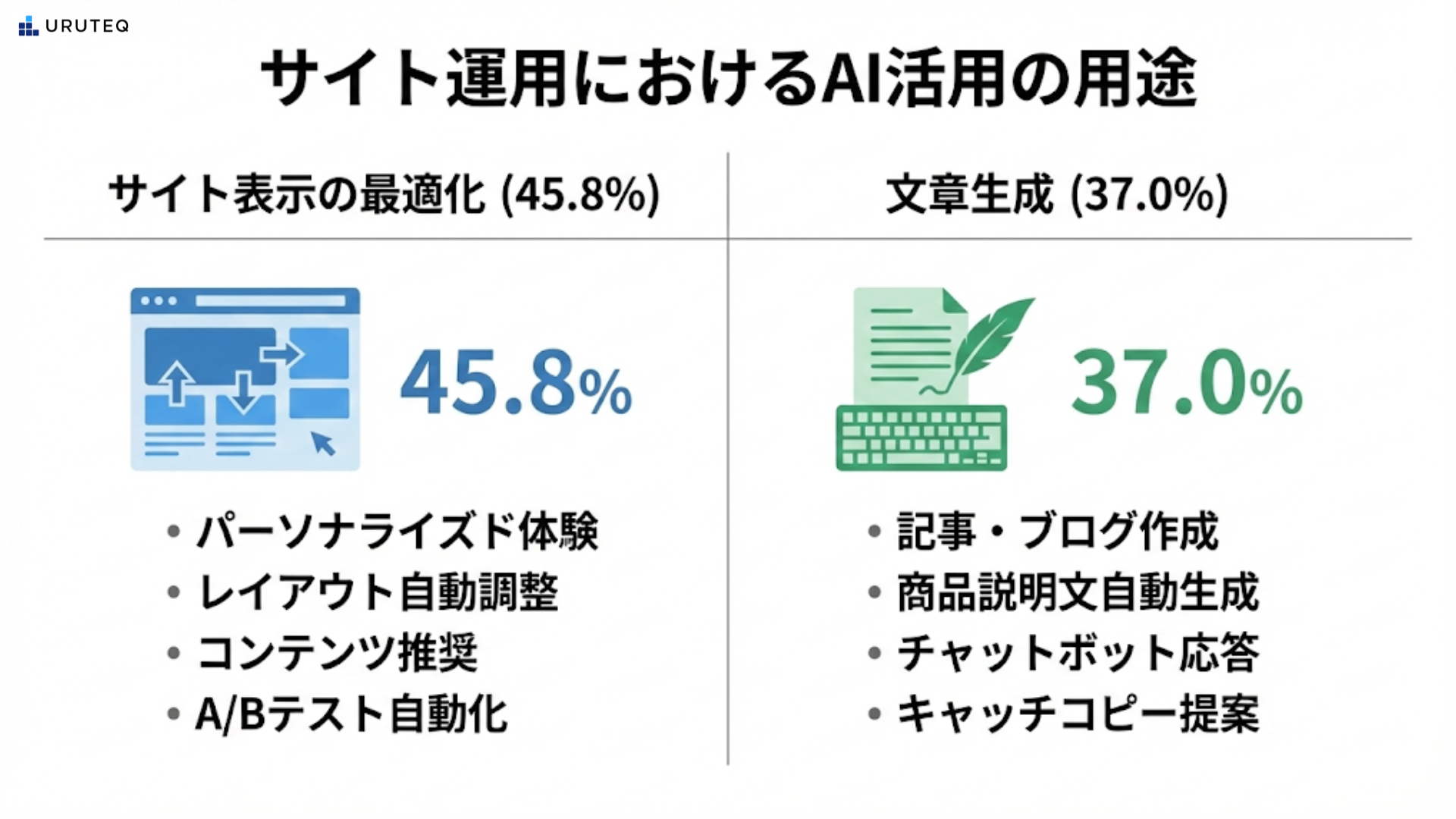 特筆すべきは、国内のB2B企業において、自社サイト上のコンテンツをパーソナライズ表示するためにAIを活用している企業が45.8パーセントと最多になっている点です。これは、ChatGPTなどによる文章生成の利用率37.0パーセントを上回る数字であり、誰に何を出すべきかという最適化にAIの真価を見出す企業が増えていることを物語っています(出典:ferret One「第5章:サイト運用におけるAI活用と用途|BtoB調査レポート2025〖サイト運用編〗」https://ferret-one.com/blog/site-operation-vol5-ai)。