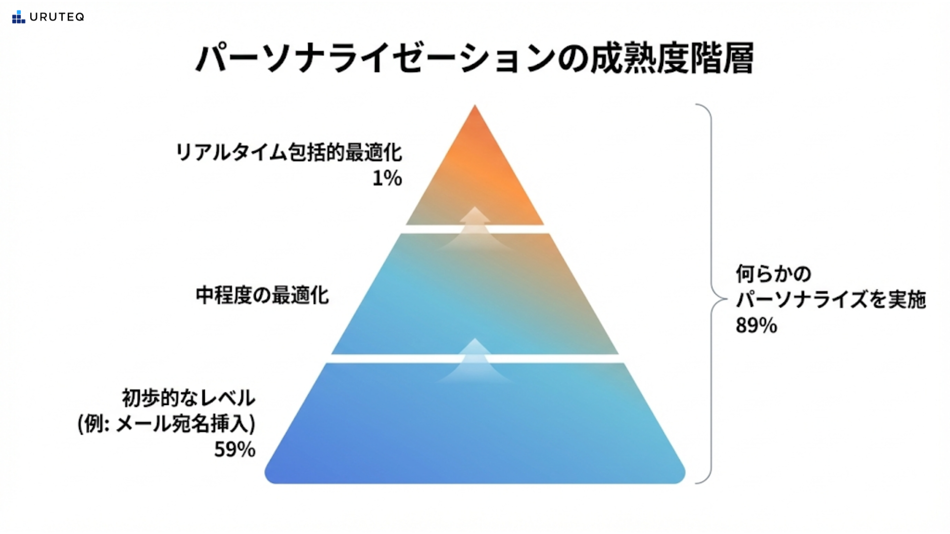 一方で、グローバルな視点で見ると、理想と現実のギャップも浮き彫りになります。マーケターの89パーセントが何らかのパーソナライゼーションを行っていると回答していますが、そのうち59パーセントは、メールの宛名を挿入するといった、1から2チャネルでの初歩的なレベルにとどまっています(出典:Content Marketing Institute「B2B Content and Marketing Trends: Insights for 2026」https://contentmarketinginstitute.com/b2b-research/b2b-content-marketing-trends-research)。