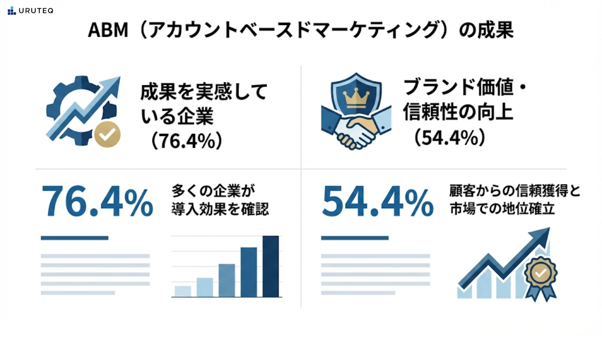 日本国内においてもABMへの関心は高く、認知度は42.0パーセントに達しています。さらに、認知している企業の実に70.6パーセントがすでに導入を済ませており、実践企業の76.4パーセントが何らかの成果を実感しています。具体的な成果として、自社のブランド価値や信頼性の向上を挙げた企業が54.4パーセントで最も多くなっている点は、単なる効率化を超えたABMの本質的な価値を示していると言えるでしょう(出典:FNNプライムオンライン「〖BtoB企業のマーケ担当者に調査〗ABM(アカウントベースドマーケティング)を知っている企業の70.6%が実践!うち約8割が、成果を実感」https://www.fnn.jp/articles/-/825319)。