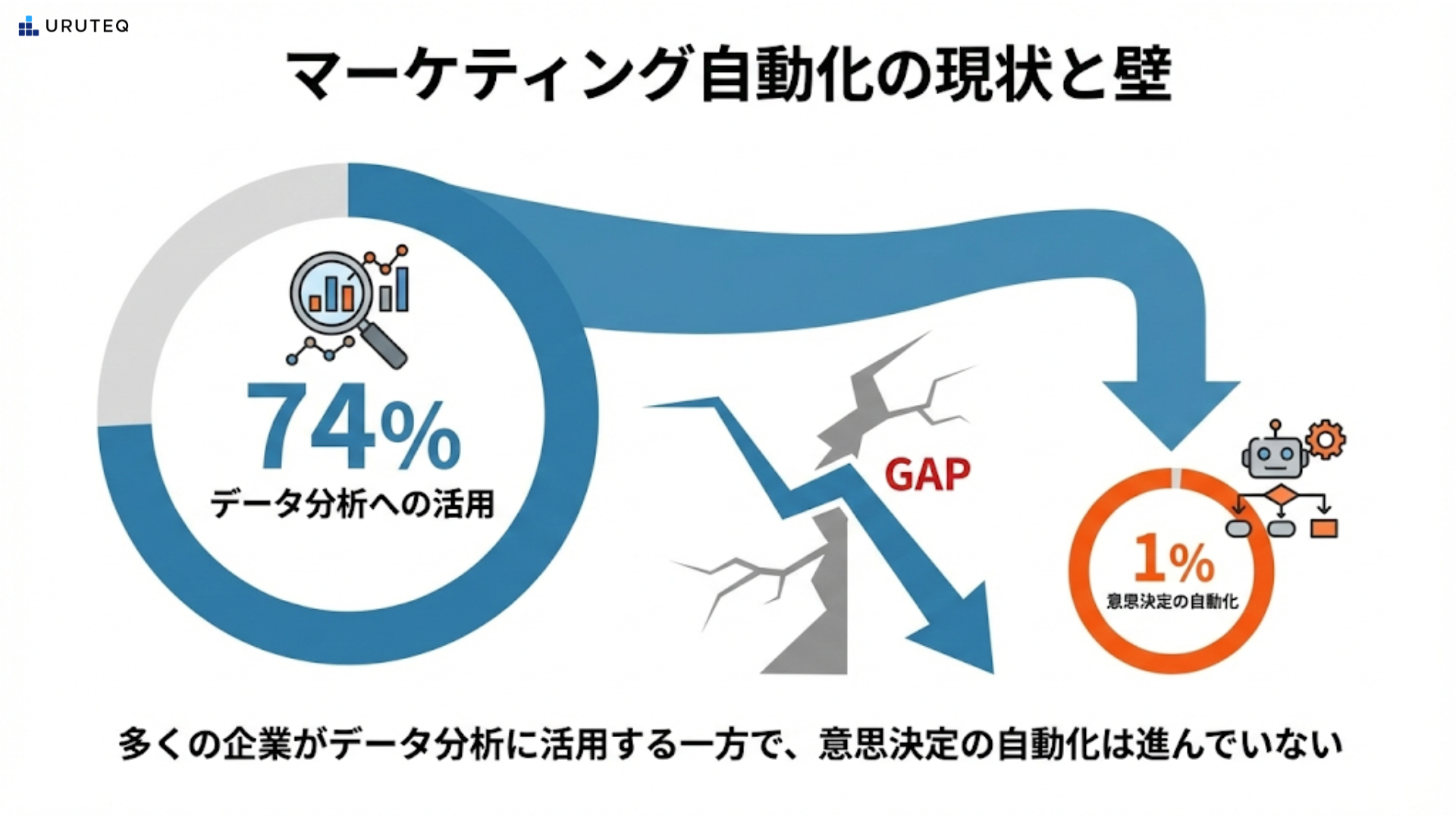 日本の上場企業を対象とした調査では、データ分析にテクノロジーを活用している企業が74パーセントに上る一方で、意思決定や実際の処理までAIで自動化できている企業は、わずか1パーセントにすぎないという衝撃的な実態が報告されています。
