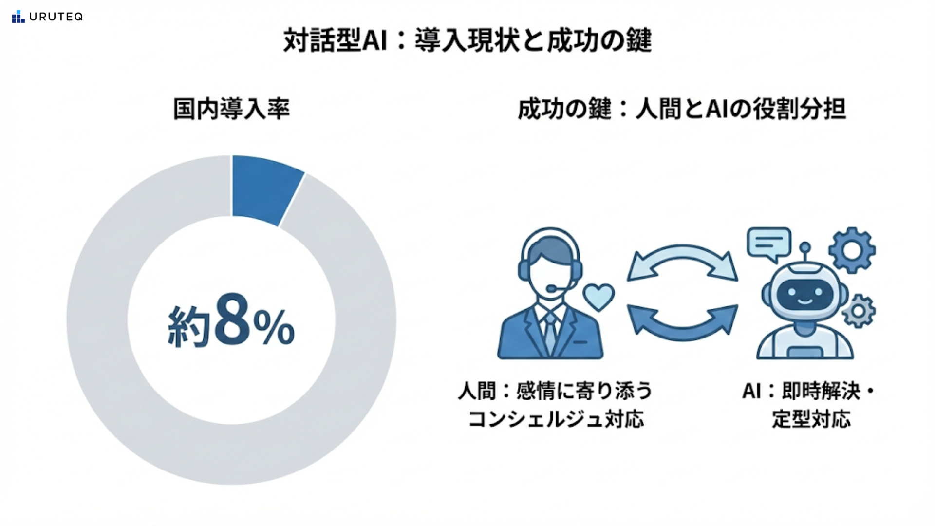 B2Bにおいても、見込み客への24時間対応や、サイト訪問者へのパーソナライズされた案内など、顧客エンゲージメントを高めるためのユースケースが注目されています。しかし、国内での導入率はまだ8パーセント程度であり、多くの企業はこれから導入を本格化させる段階にあります(出典:ITmedia オルタナティブ・ブログ「マーケティングのAI活用は「踊り場」か?:『ビジネス2.0』の視点」https://blogs.itmedia.co.jp/business20/2025/12/ai_2073.html)。