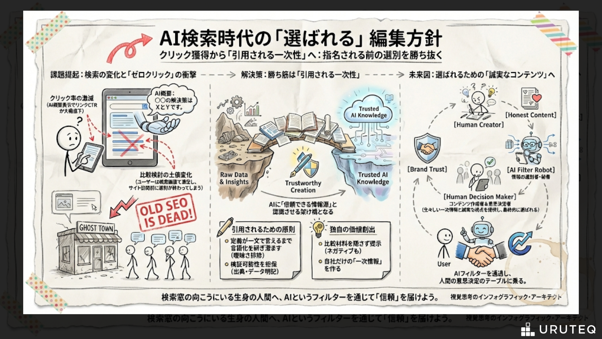 つまり、これからのB2Bマーケティングにおいて重要になるのは、まだ指名されていない段階、すなわち情報収集のフェーズで、いかにしてAIに「信頼できる情報源」として認識され、その要約の中に自社の存在や独自の視点を滑り込ませるか、という点に集約されます。
