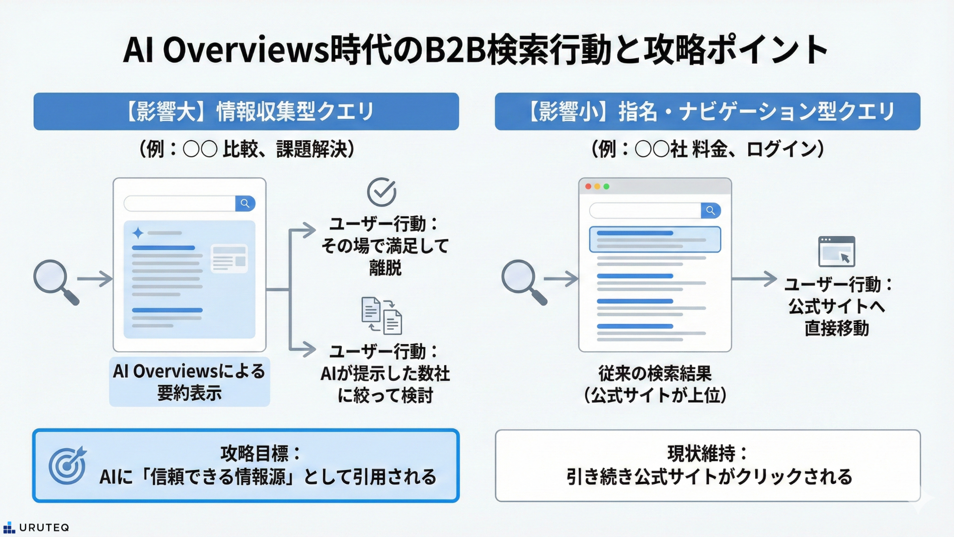 では、すべての検索行動でクリックが激減するのでしょうか。必ずしもそうではありません。特にB2Bの文脈では、影響を受ける領域とそうでない領域の濃淡がはっきりしてくると考えられます。
