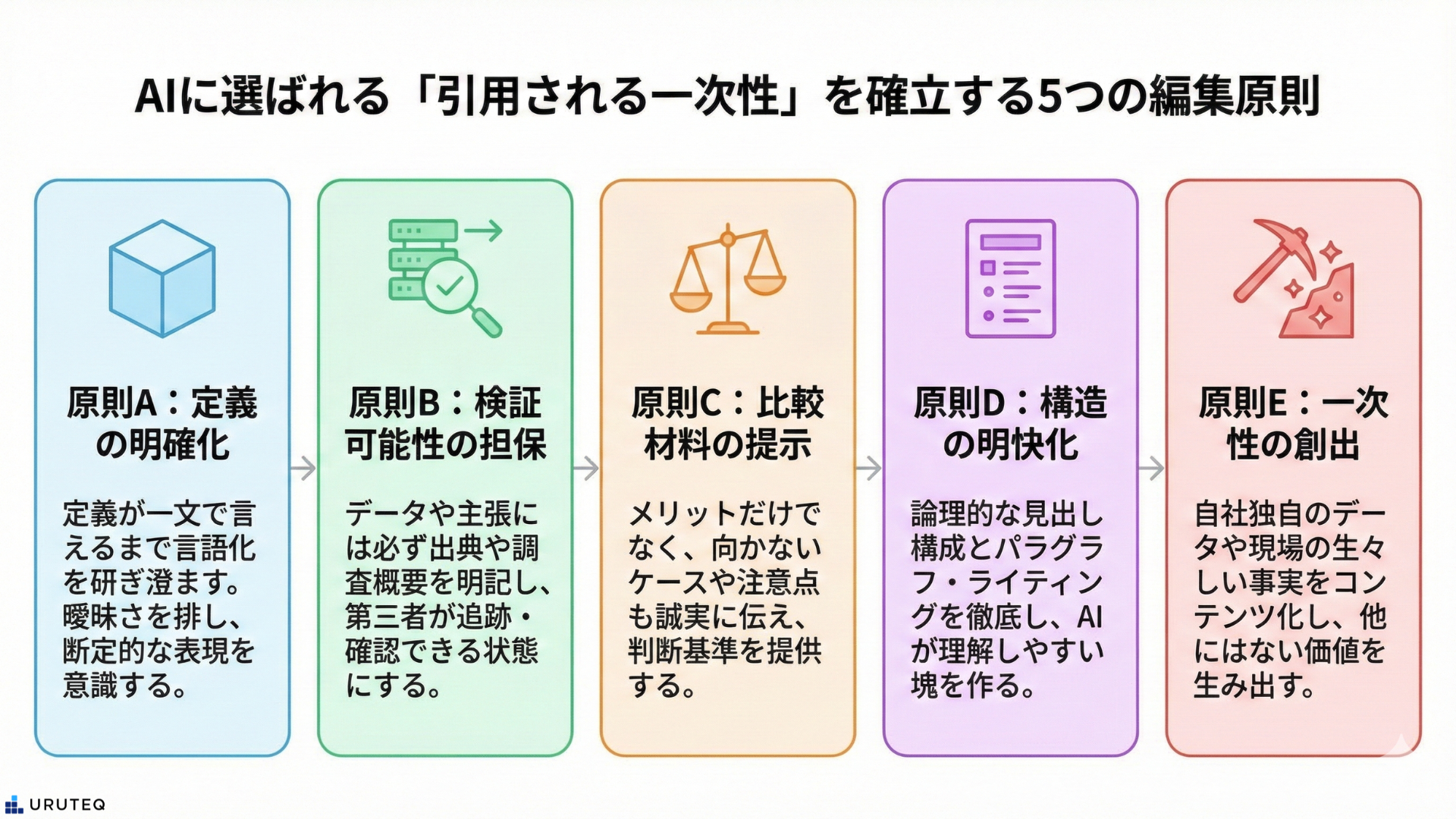 そのためには、AIが学習しやすく、かつ人間が読んでも信頼に足るコンテンツが必要です。ここからは、具体的にどのような編集方針を持てば、AIに選ばれ、人間に響くコンテンツになるのか、5つの原則に分解して解説します。