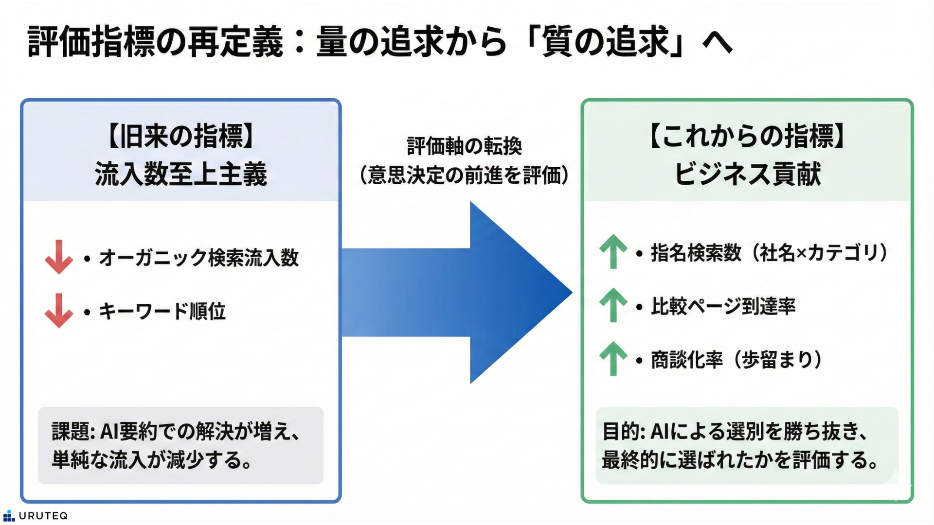 これまで重視されてきた「流入数」というKPIは、徐々にその意味を変えていくでしょう。これからは「どれだけ比較検討の土俵に載れたか」、あるいは「AIに引用され、選ばれる存在になれたか」という、より質的な指標が重要になってきます。