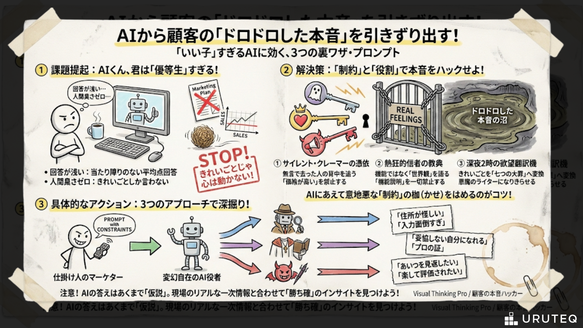 AI活用でやりがちな失敗は、ぼんやりした質問をして、ぼんやりした答えにガッカリすること。 今回紹介した3つに共通するのは、「あえて強い制約をかけて、無理やり本音を吐かせる」というアプローチです。