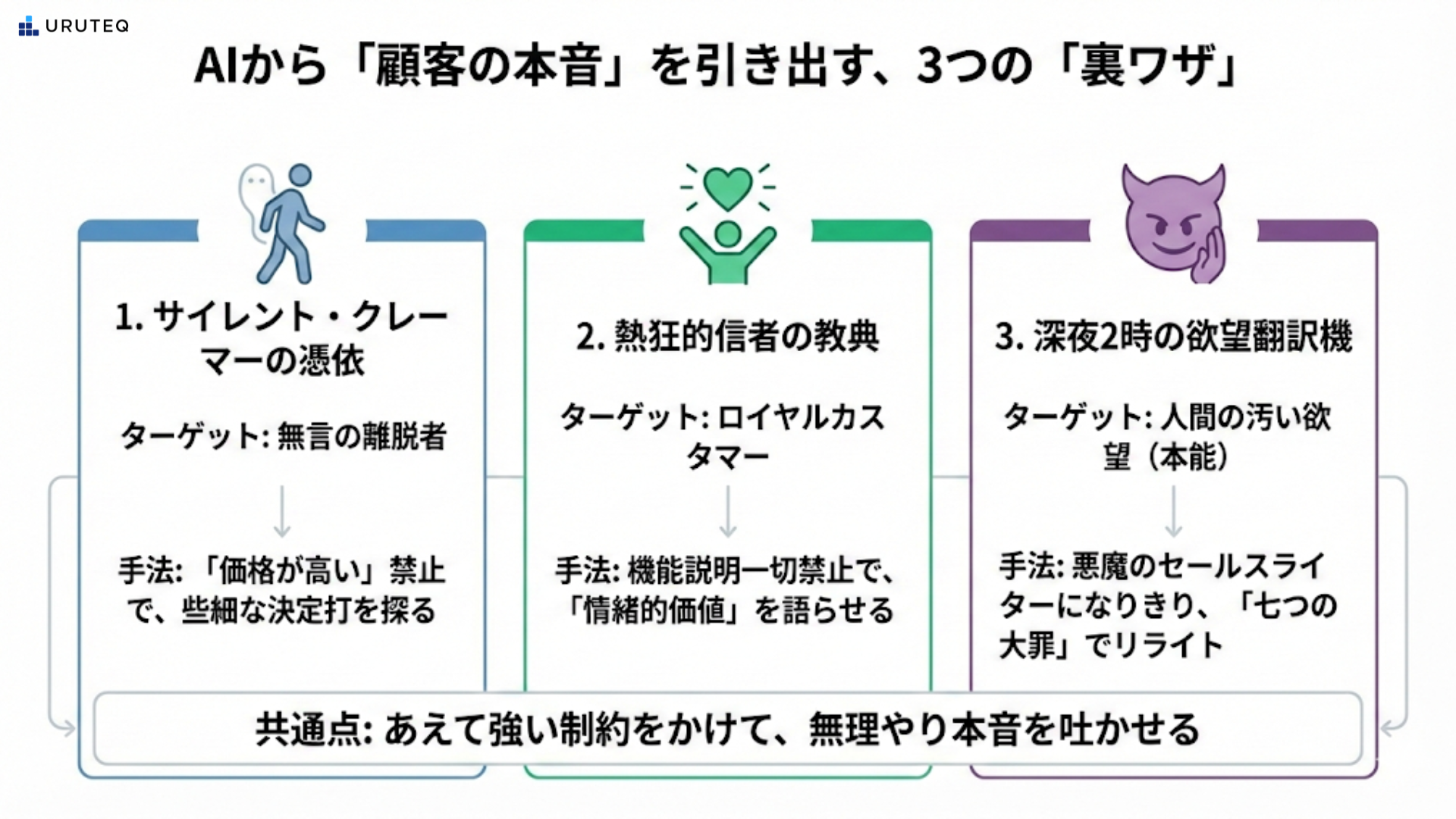 今日は、私が現場で実際に使っていて、正直あまり教えたくない(けど教えちゃう)、顧客心理を深掘りするための「魔法のプロンプト」を3つ、こっそりシェアします。
