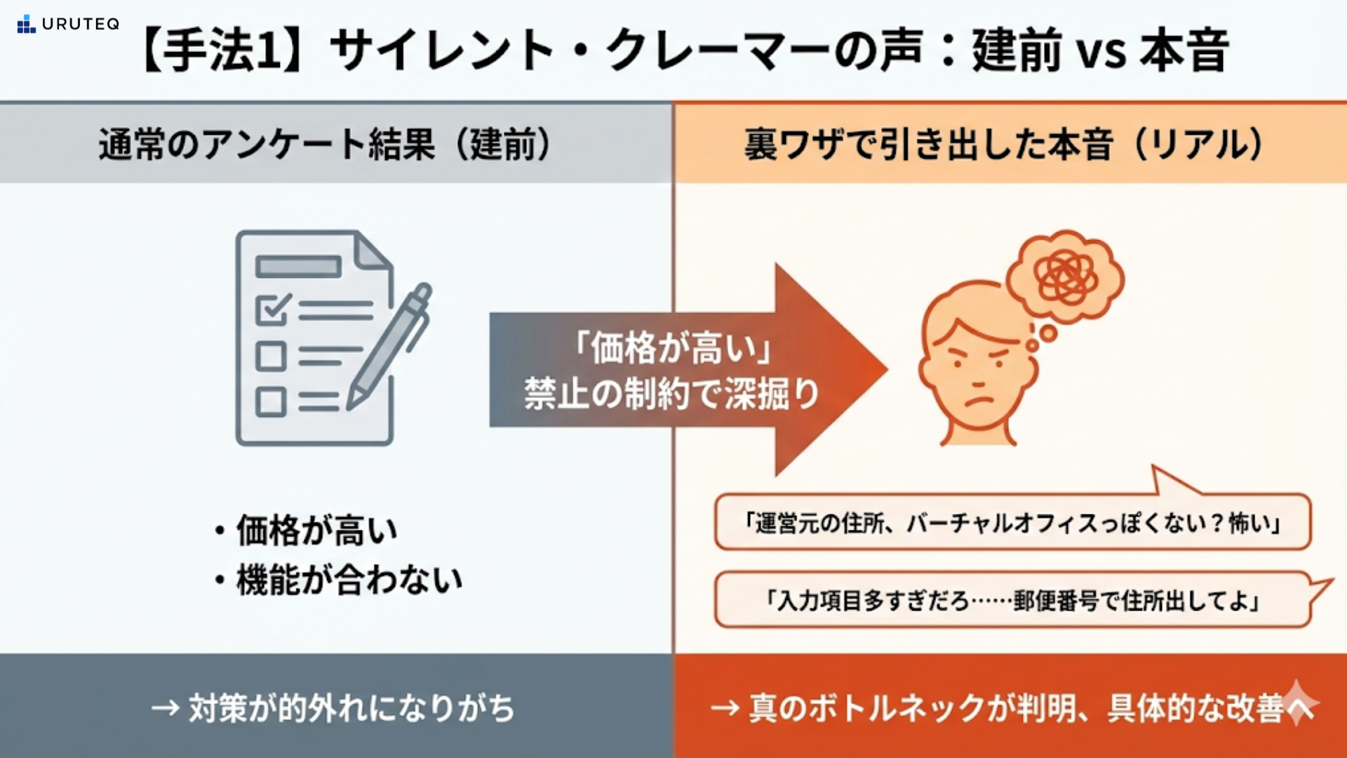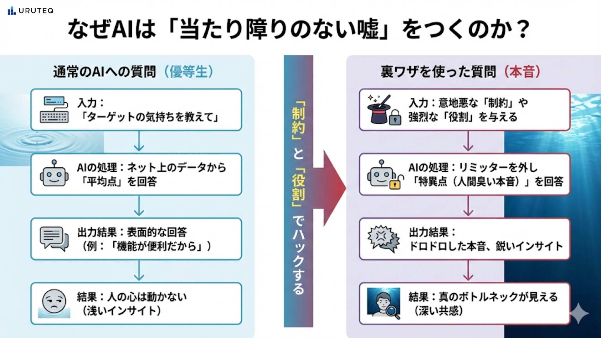 これ、ゾッとしますよね。 なぜかと言うと、AIが出した答えは「間違ってはいないけど、浅い」からなんです。AIはネット上の膨大なデータから「平均点」の答えを作ります。でも、人間がモノを買わない理由って、もっと理不尽で感情的なものじゃないですか?