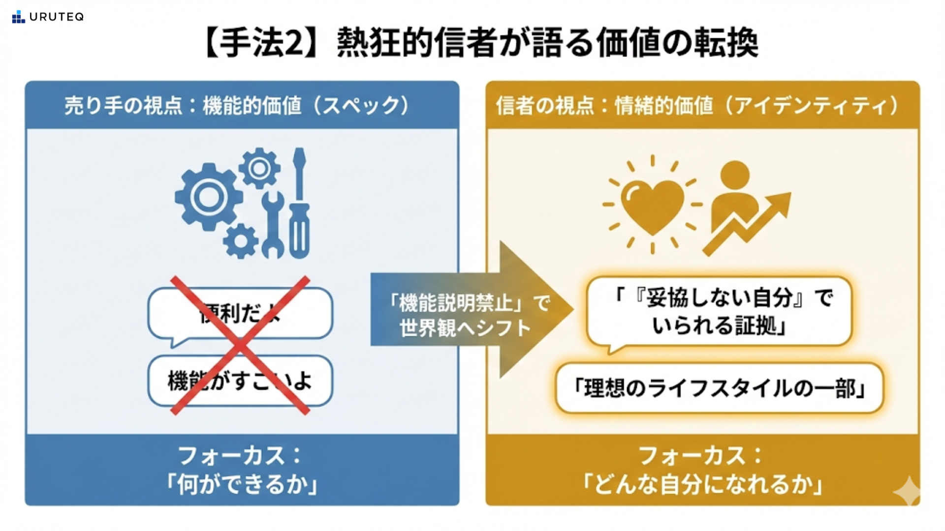 Appleやスタバのファンって、スペック表を見て買ってるわけじゃないですよね。「それを持っている自分が好き」だから買うんです。 でも、売り手になるとついつい「機能」や「メリット」ばっかり語っちゃう。悲しい性(さが)です。