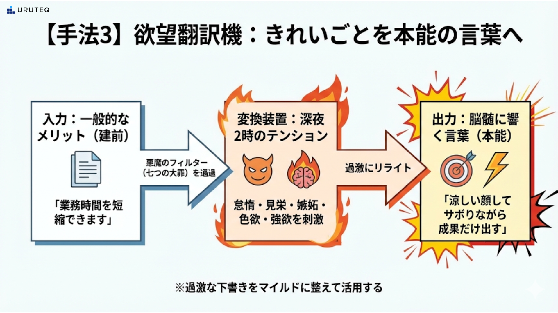 「悪魔のライター」になりきらせることで、AIのリミッターを外します。 「業務効率化」なんて退屈な言葉が、こう変わります。