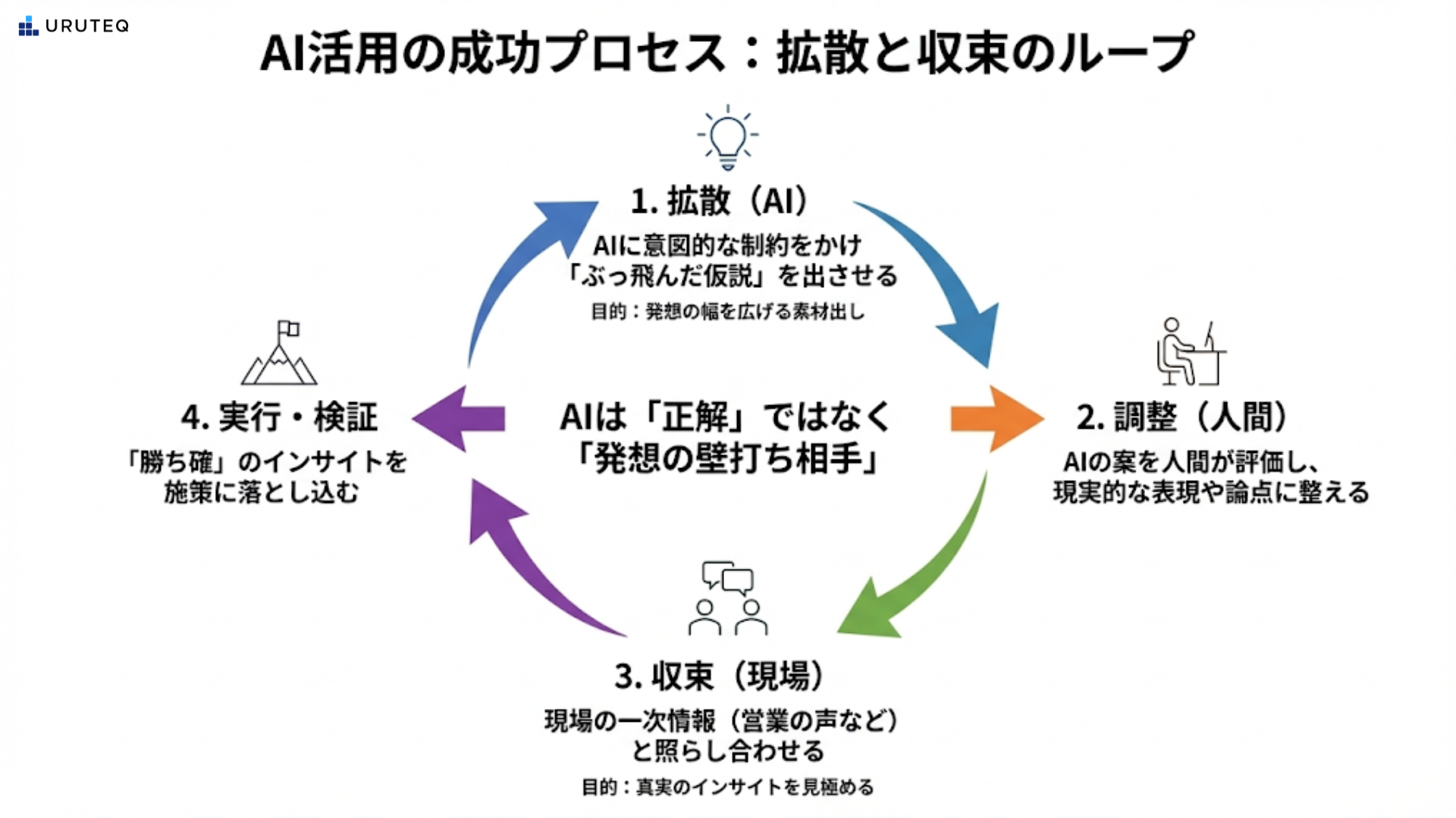 大事なのは、これを「正解」として扱うのではなく、「発想の幅を広げるための素材」として使うことです。人間だとどうしても無難な発想になりがちなので、AIに一度ぶっ飛んだ案を出させて、そこから人間が調整する。「拡散と収束」ってやつです。