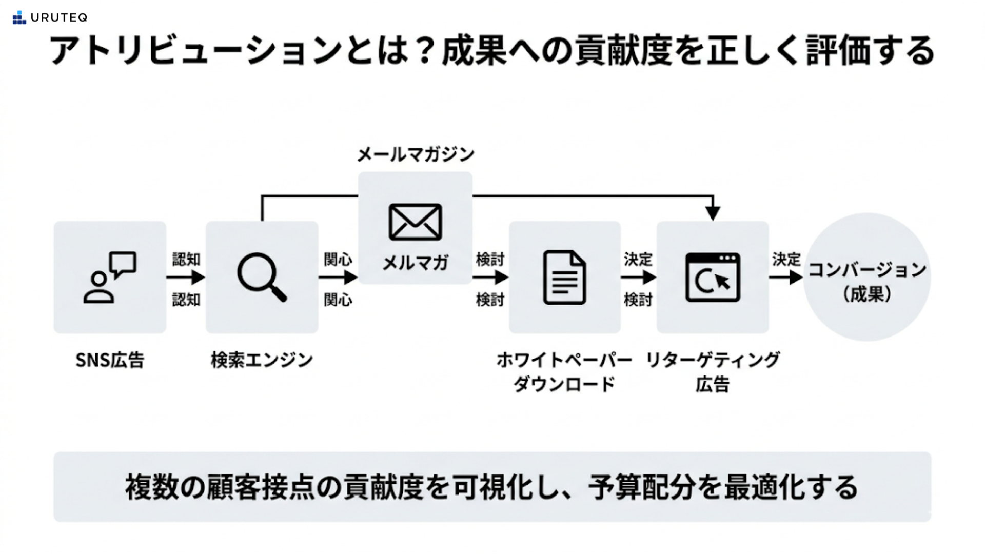 このような長期的な経路をたどった場合、ラストクリックのみの評価では動画広告やオウンドメディアの貢献度がゼロになってしまいます。アトリビューションは、見過ごされがちな初期の認知獲得や、中間の育成フェーズの施策にも適切な評価を与え、全体の予算配分を最適化する手法として機能します。