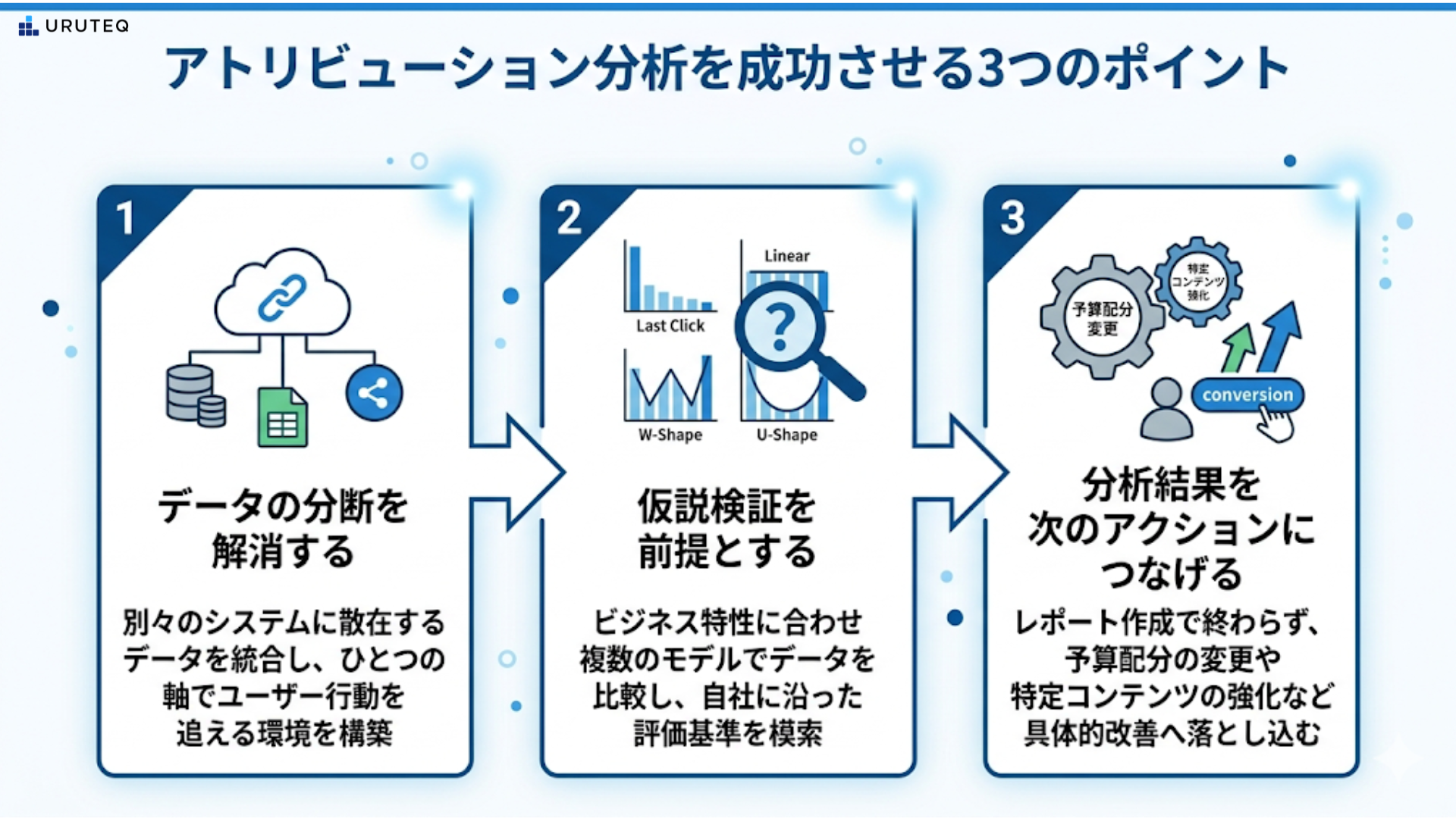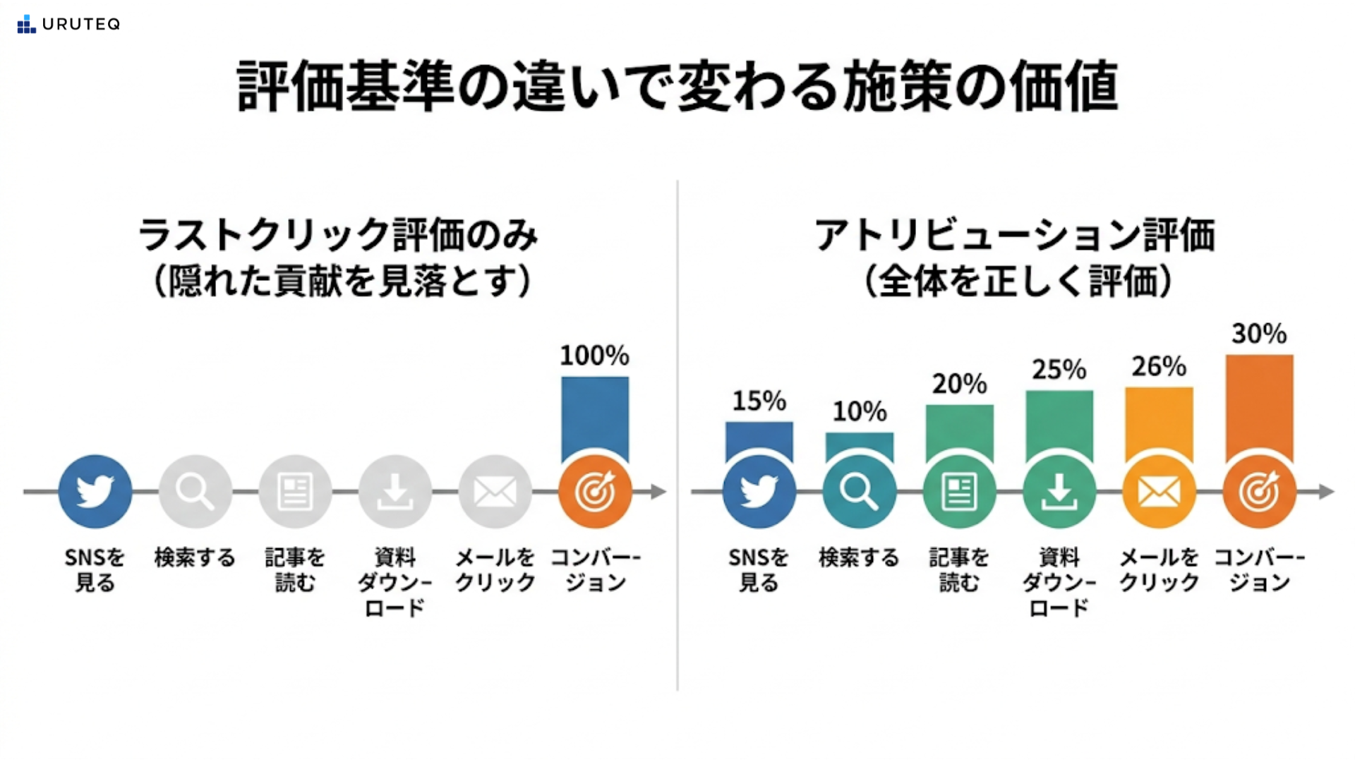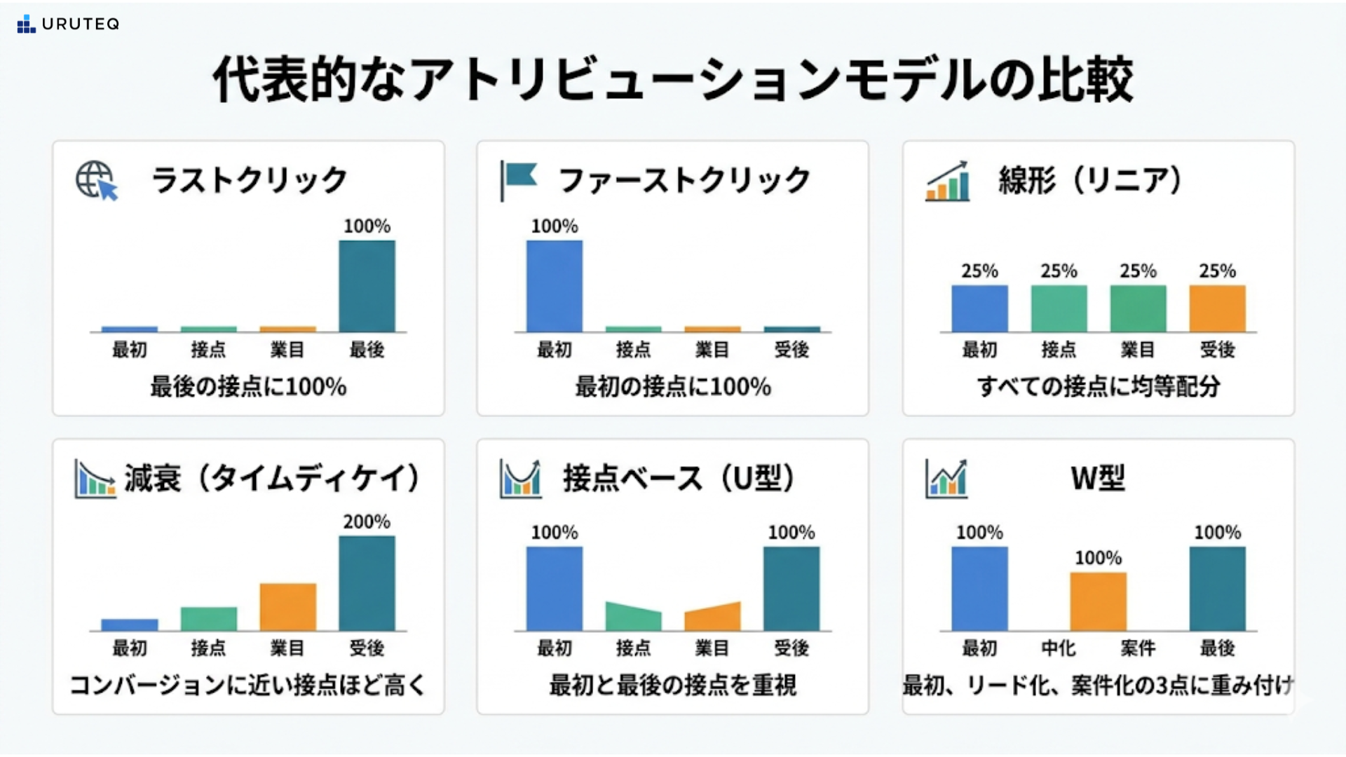 | 接点ベース (U型) | 最初と最後の接点を重視(例:各40%、中間を均等配分) | 認知と獲得の両方をバランス良く評価したい場合。 |