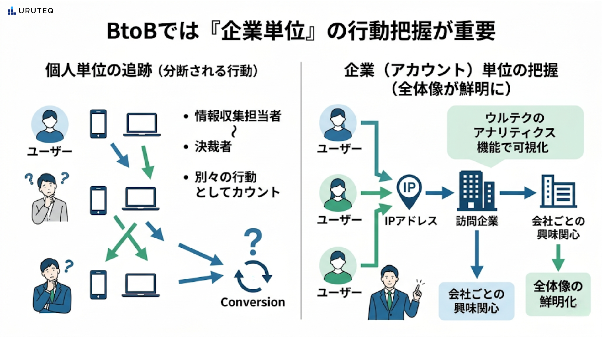 IPアドレスなどをキーにして企業単位の動きを捉えることで、コンバージョンしていない企業の中から追うべき会社を見つけやすくなり、認知で止まっているのか比較検討に進んでいるのかを見分けられます。アトリビューションの視点とウルテクのアナリティクス機能を組み合わせることで、特定の施策がどの企業の検討を後押ししたのかが鮮明になるはずです。