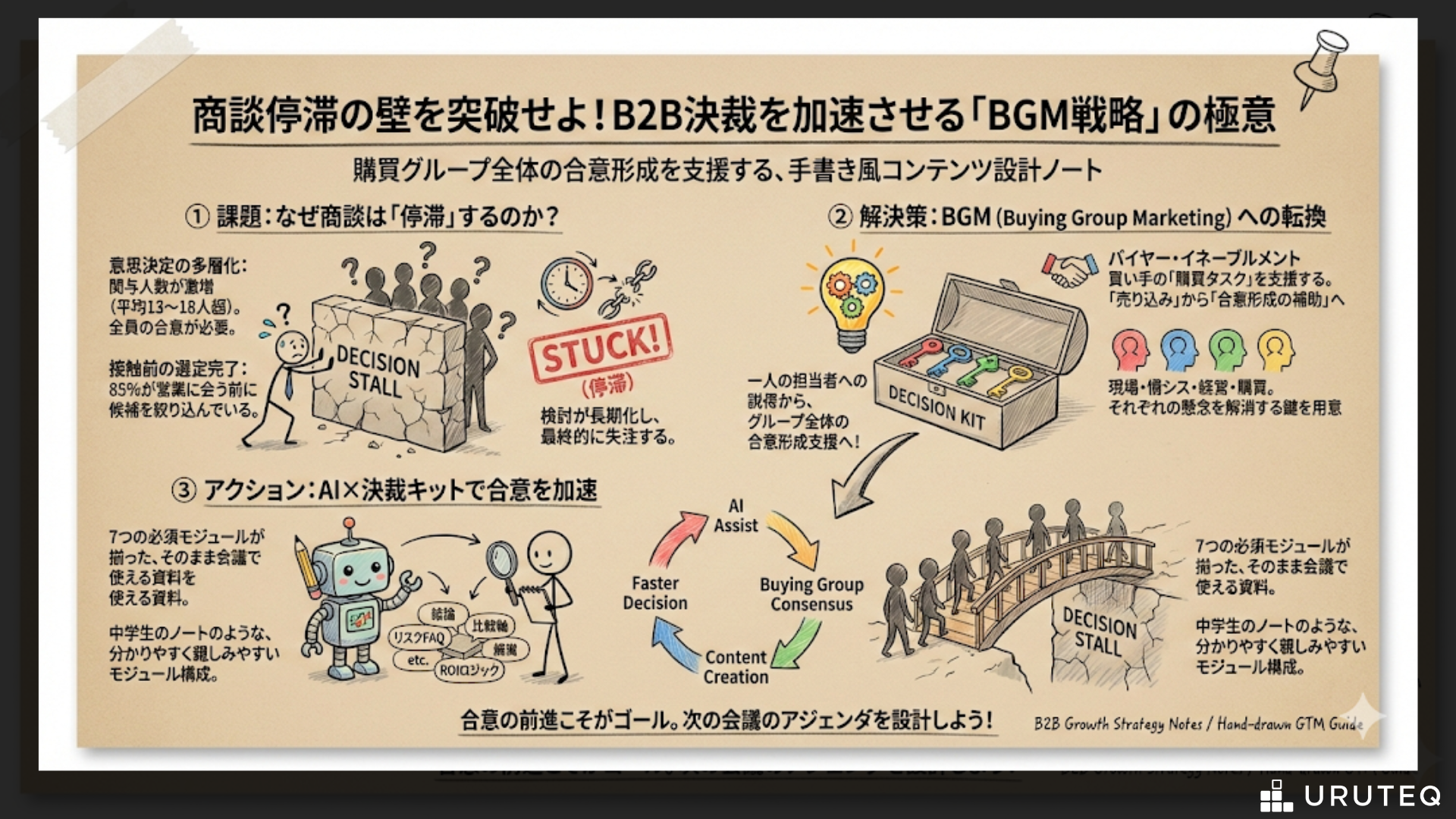 2026年に向けて取り組むべきは、BGM(Buying Group Marketing)の視点から役割別の論点セットを用意し、AIを駆使して徹底的に根拠を管理し、反対理由を潰し込むためのデシジョン・キットを完備することです。