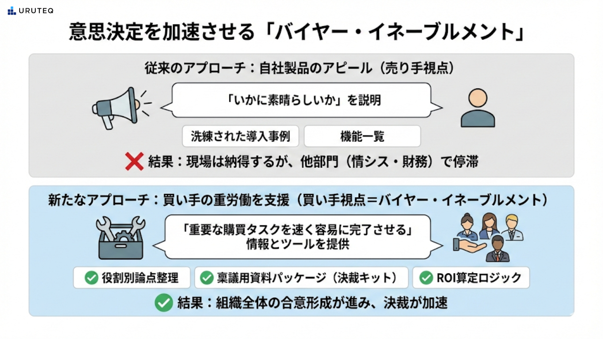 Aさんは気づきました。自分は現場向けのコンテンツは作っていたが、バイイング・グループ全体、つまり経営や情シス、購買担当者を支援するためのバイヤー・イネーブルメントの視点が完全に欠落していたのです。この失敗から、Aさんは役割別の論点整理と、そのまま社内稟議に使える資料のパッケージ化、すなわち決裁キットの制作に着手することになります。