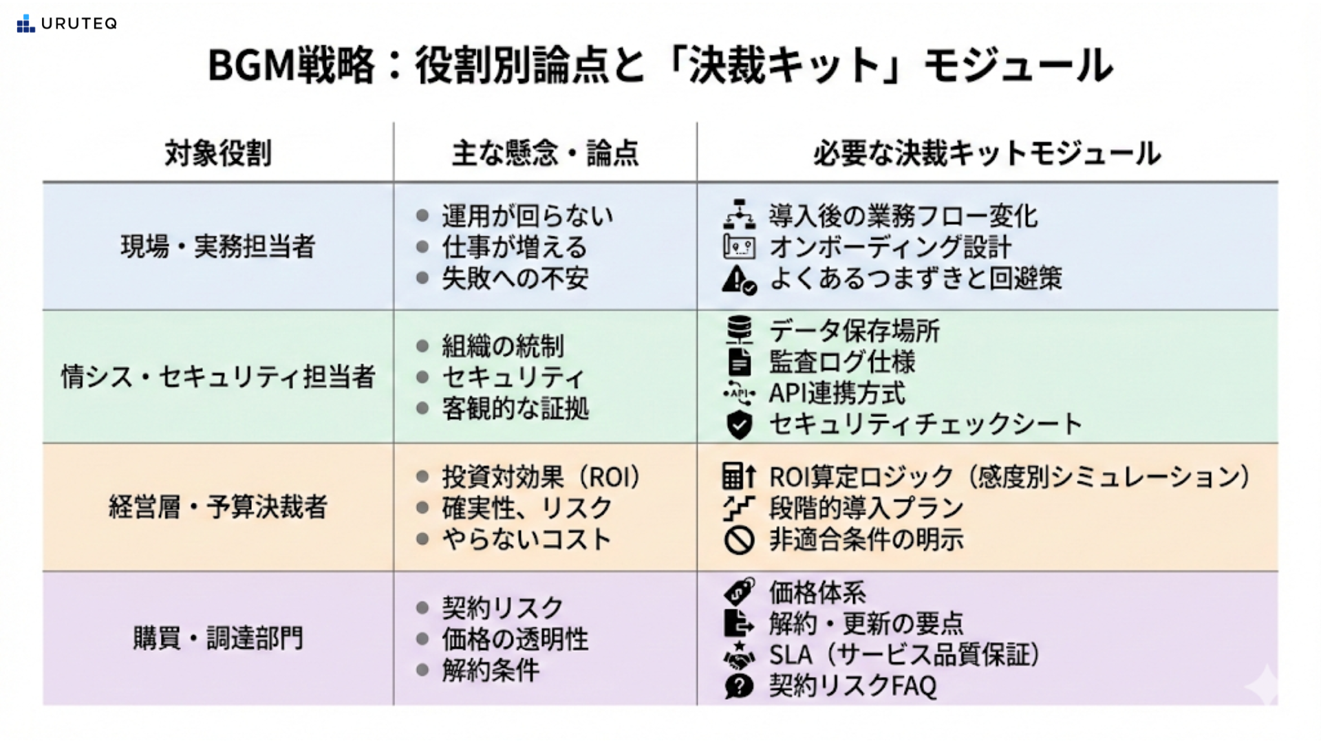 四つ目は、購買や調達部門向けです。彼らは契約上のリスクを最小化することを任務としています。価格体系の透明性、解約や更新の要点、SLA(サービス品質保証)の要点など、稟議で突かれやすい論点への回答をあらかじめ用意しておきます。