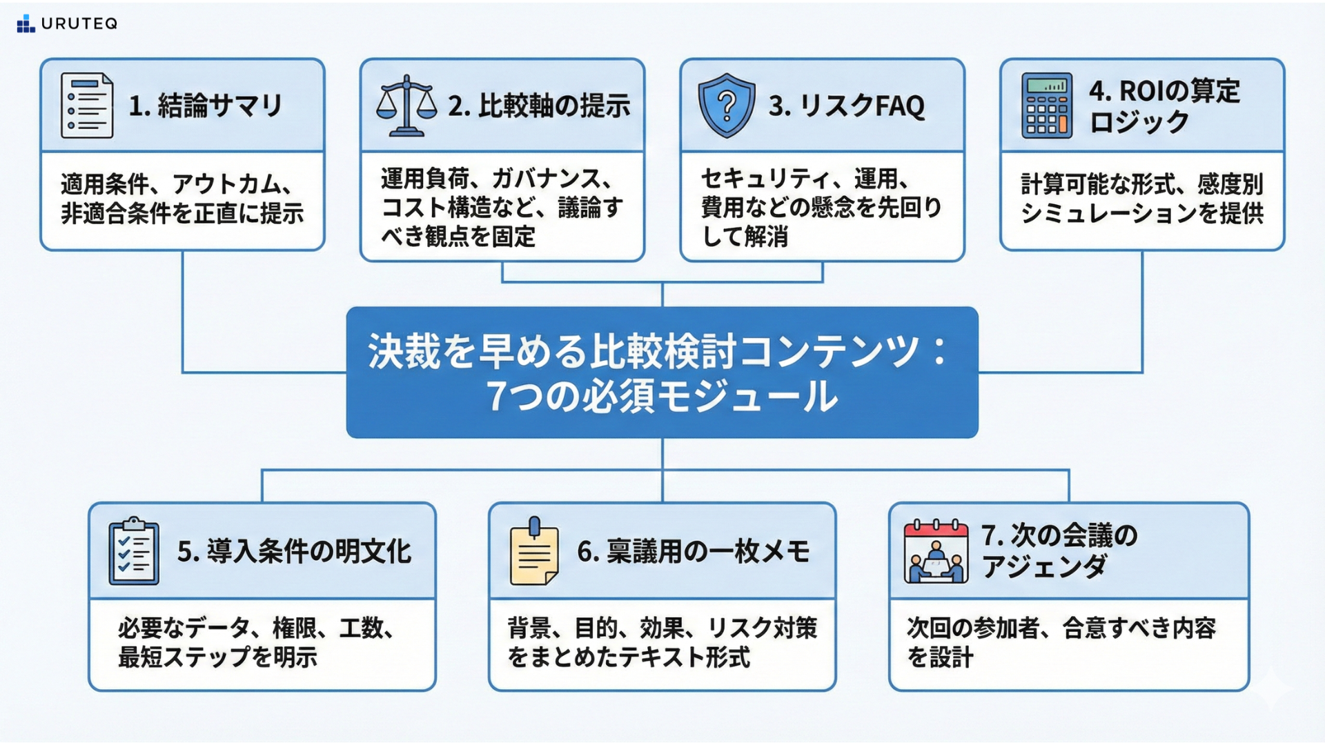 実際にどのようなコンテンツを用意すべきか。型として以下の7つのモジュールを組み合わせて構成することをお勧めします。
