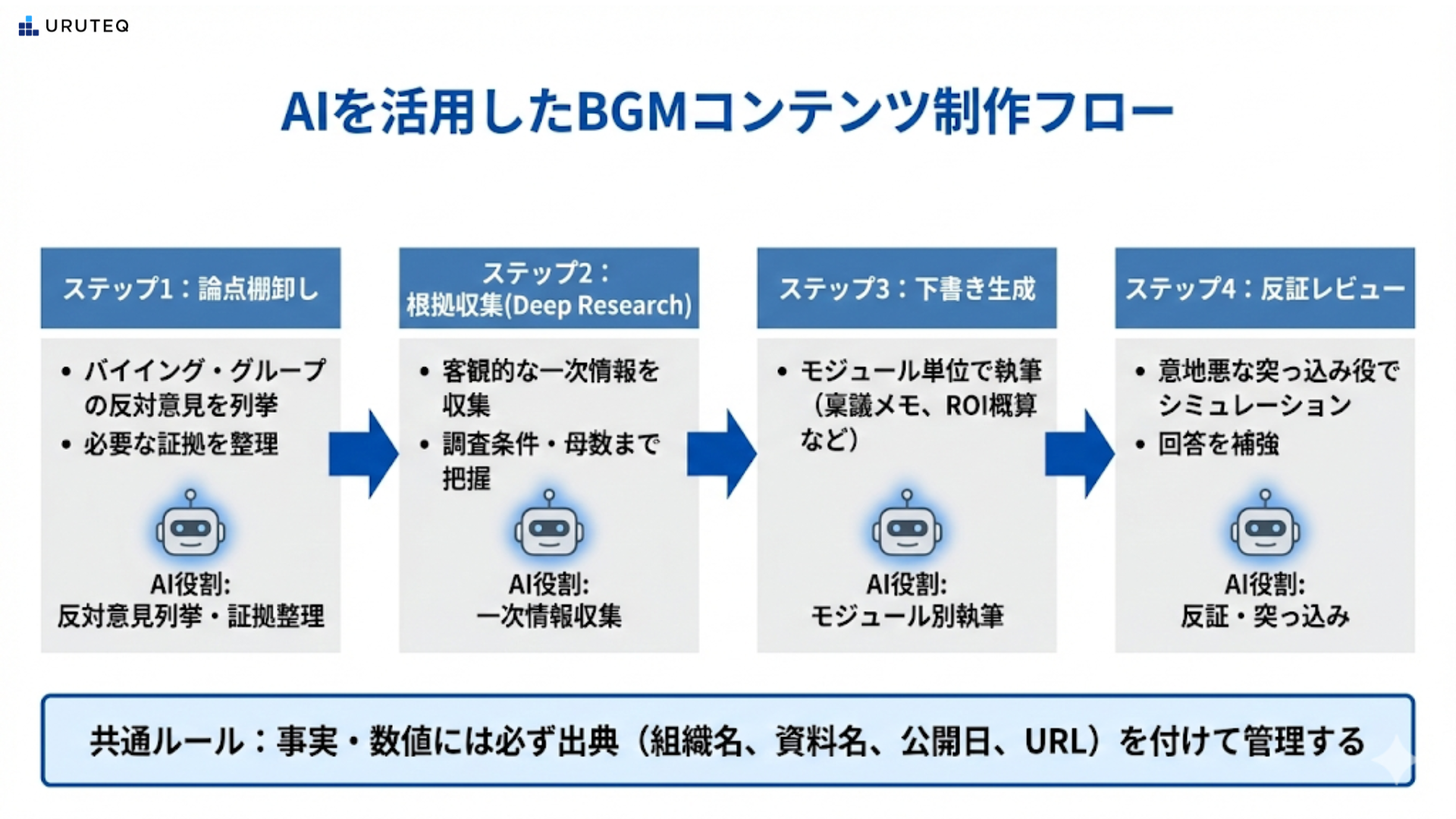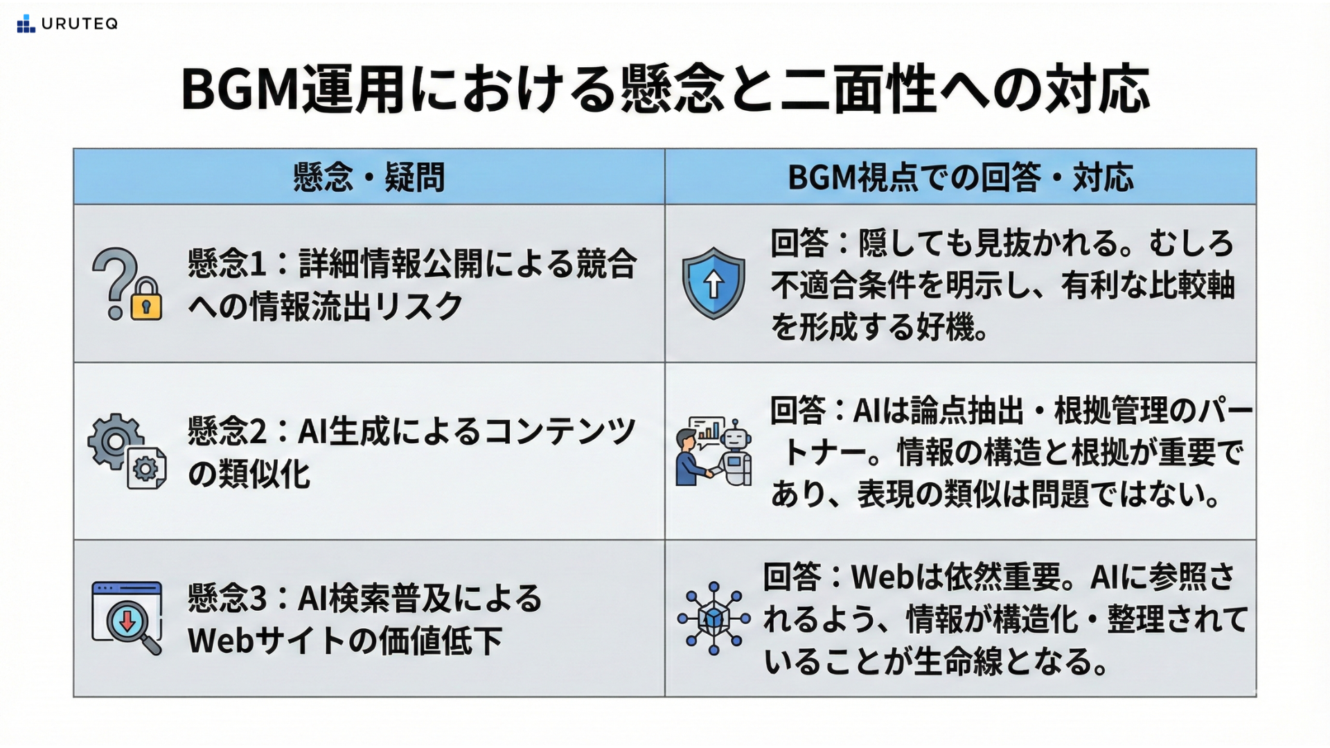 二つ目は、AIが生成するコンテンツは結局どれも似通ってしまうのではないか、という点です。 だからこそ、AIを執筆ツールではなく、BGMにおける論点抽出や根拠管理のパートナーとして使うべきなのです。情報の構造と根拠がしっかりしていれば、表現の枝葉が多少似ていても、意思決定の材料としての価値は揺らぎません。買い手は面白い文章ではなく、決めるための正しい理由を探しているからです。