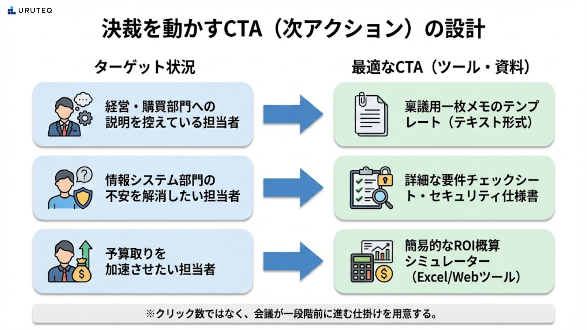 例えば、経営や購買部門への説明を控えている担当者には、稟議用一枚メモのテンプレートを。情報システム部門の不安を解消したい担当者には、詳細な要件チェックシートを。予算取りを加速させたい場合には、簡易的なROI概算シミュレーターを提示します。
