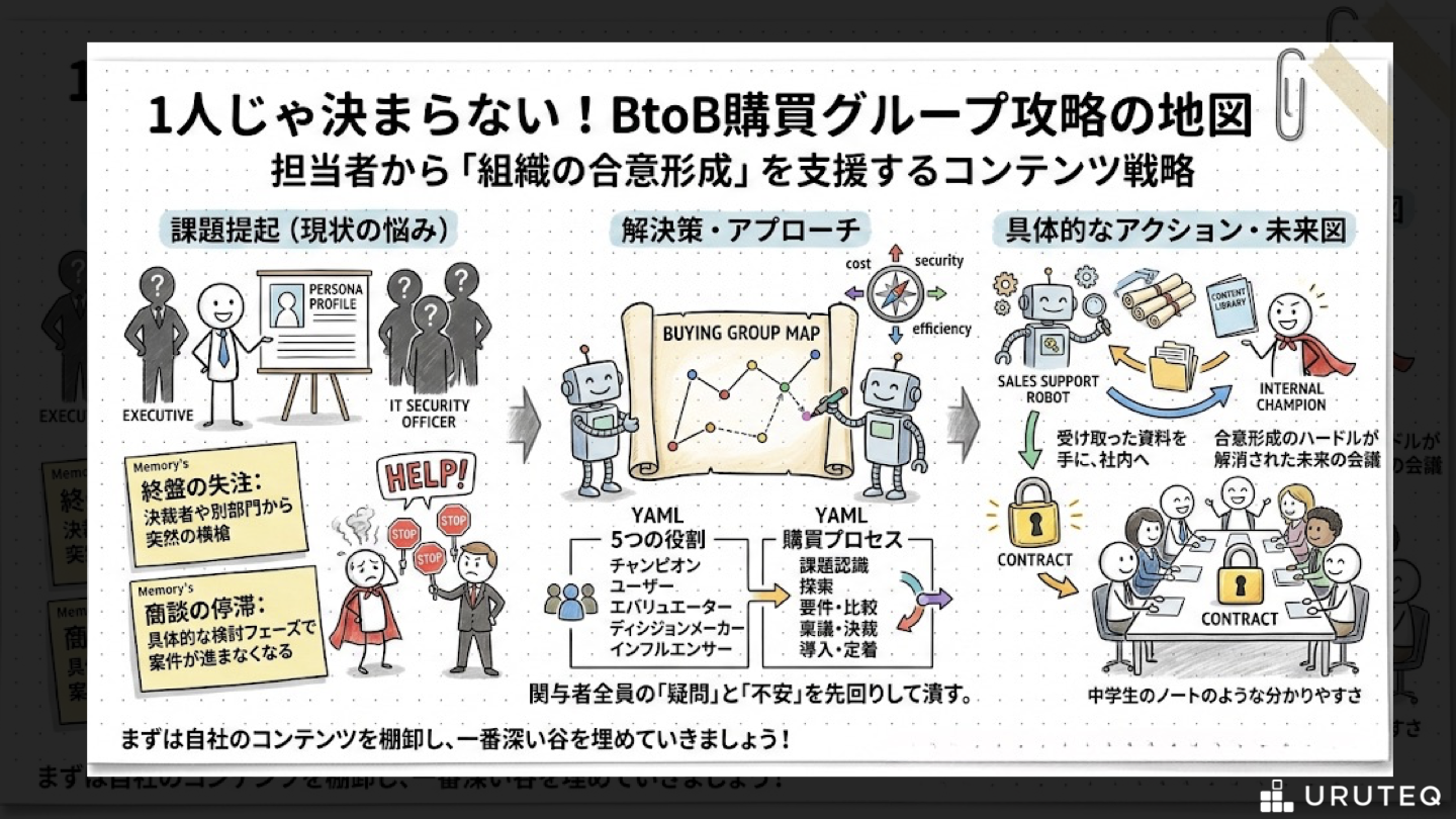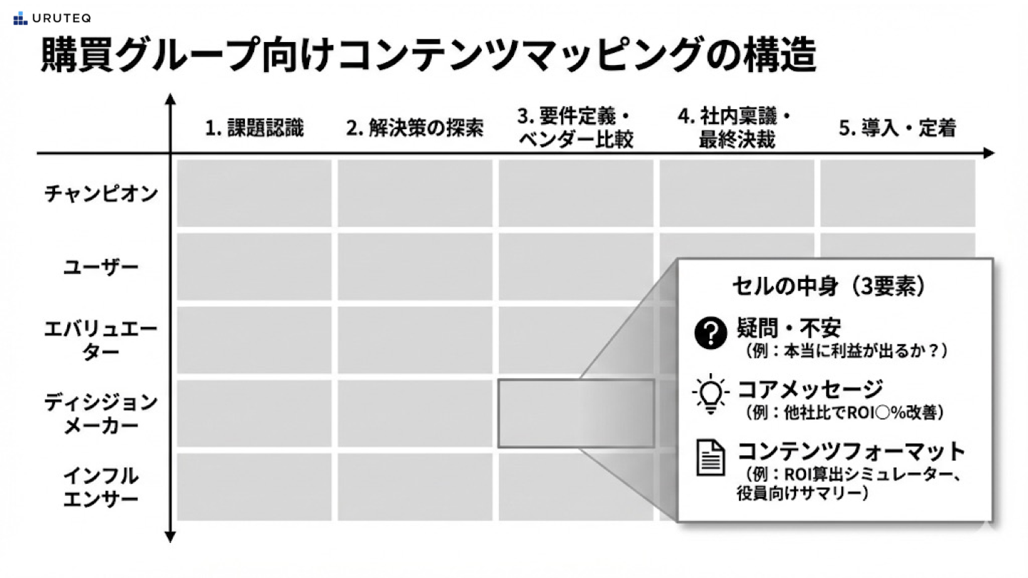 BtoBの購買プロセスは、もはや一人の担当者との一対一の対話ではありません。チャンピオンの熱意を支え、評価者の不安を取り除き、決裁者の論理を満たす。この多面的なアプローチを実現するための設計図が、購買グループを軸としたコンテンツマッピングです。