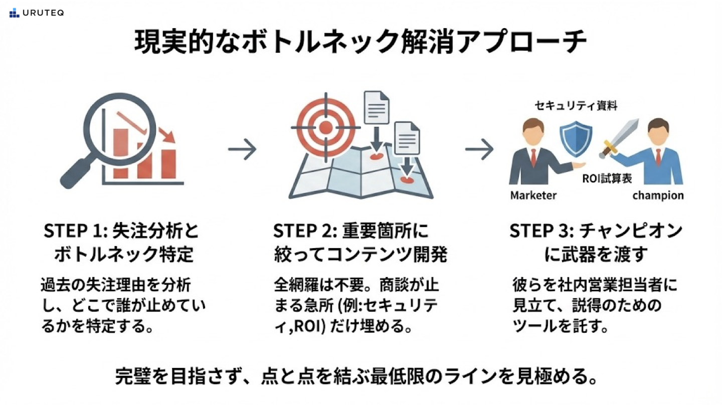この懸念に対する現実的な回答は、すべてのマスを新規で均等に埋めようとするのは現実的ではない、という点に尽きます。まずは自社の過去の失注理由を分析し、「チャンピオンが社内説得で一番つまずいているボトルネックのポイント」に絞ってコンテンツを拡充するのが最も効果的です。