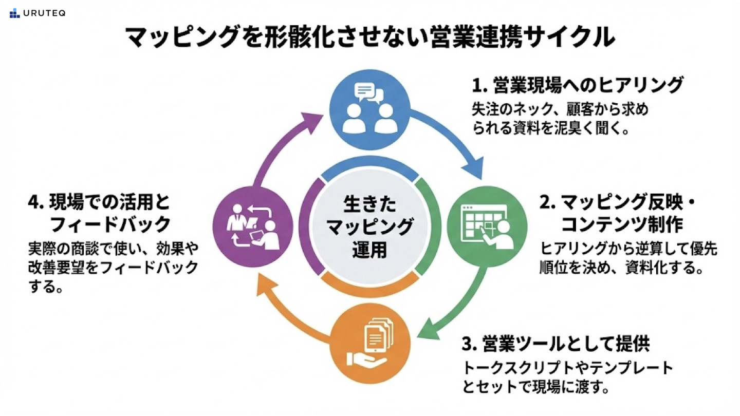 これを防ぐためには、マッピングの作成段階から営業部門を巻き込むことが不可欠です。営業会議に参加し、「最近、失注した案件でネックになったのは誰のどんな反対意見でしたか?」「お客様からよく求められるのに、手元になくて困っている資料は何ですか?」と泥臭くヒアリングし、そこから逆算してマッピングを埋めていくプロセスを共有します。