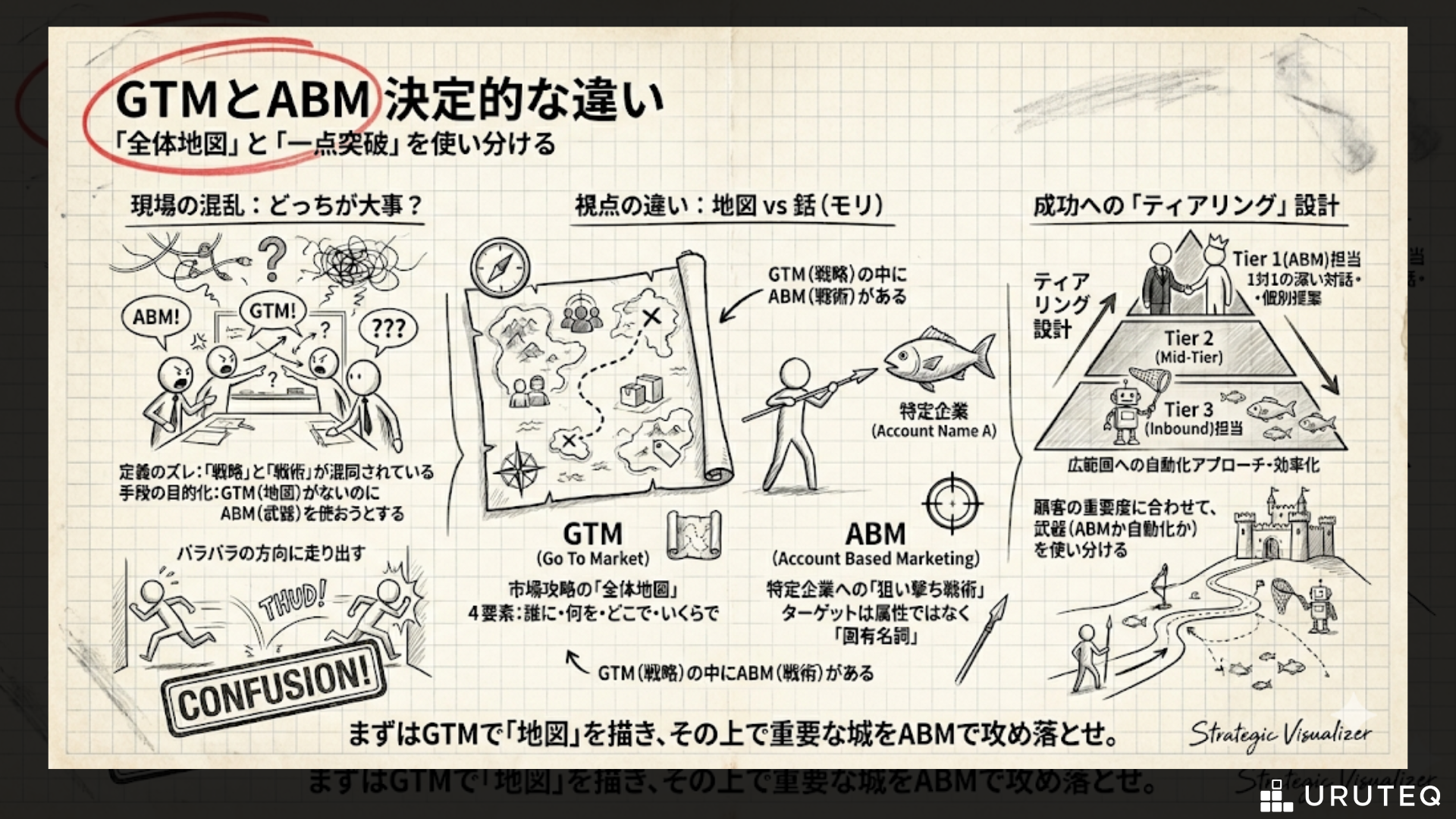 【記事概要】 「全体地図」なき「個別攻撃」は失敗する。GTMとABMの正しい使い分け