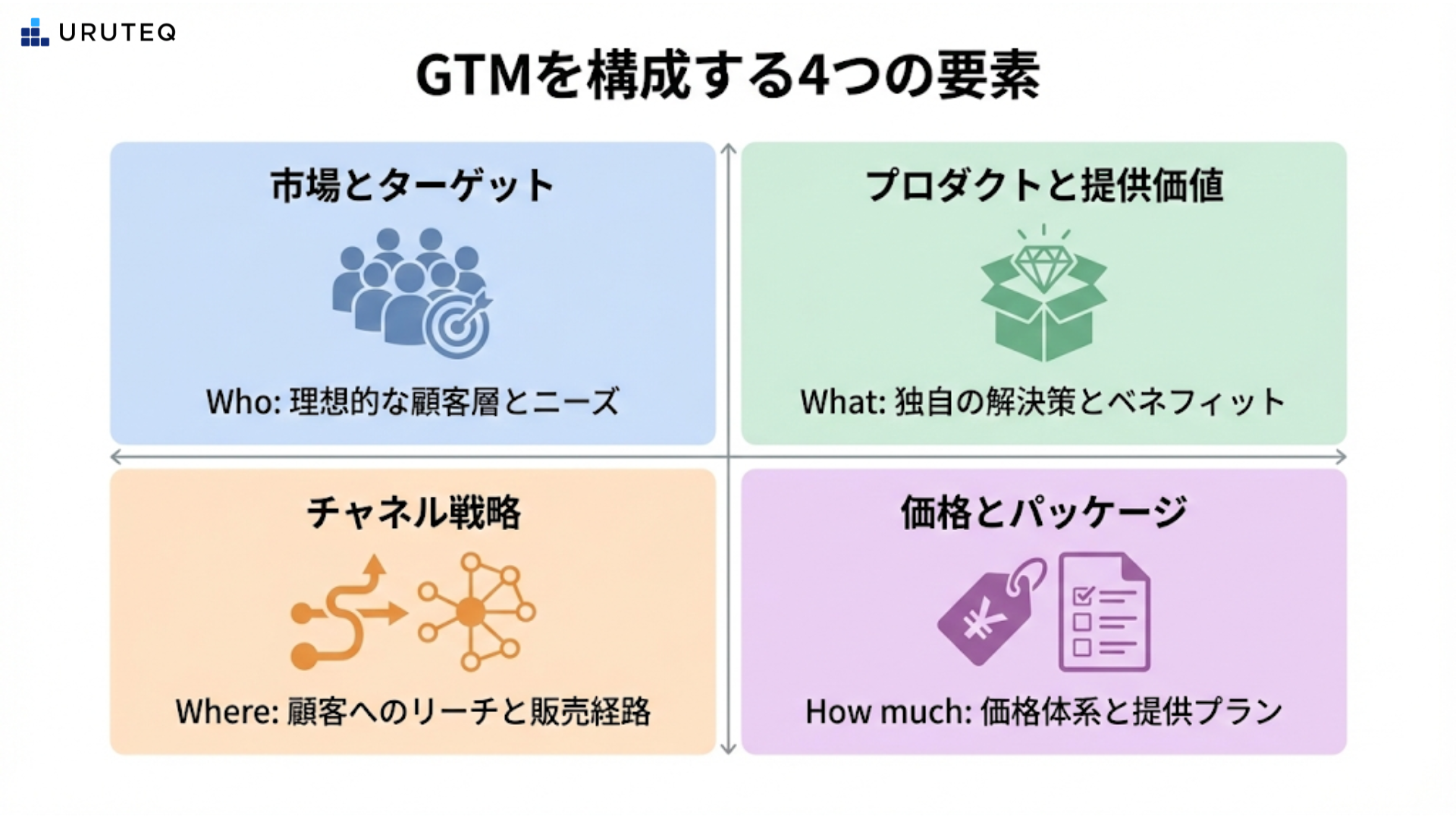 GTM戦略を策定する際、一般的に以下の4つの要素を組み合わせて設計します。