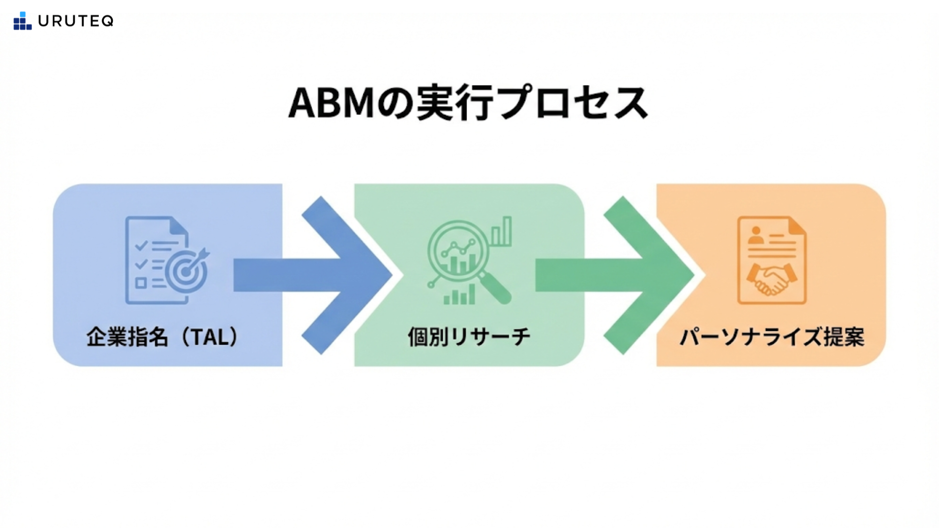 ABMでは、ターゲットを「固有名詞」で捉えます。「〇〇工業の△△事業部」「××商事の□□部長」といった粒度まで解像度を高めます。
