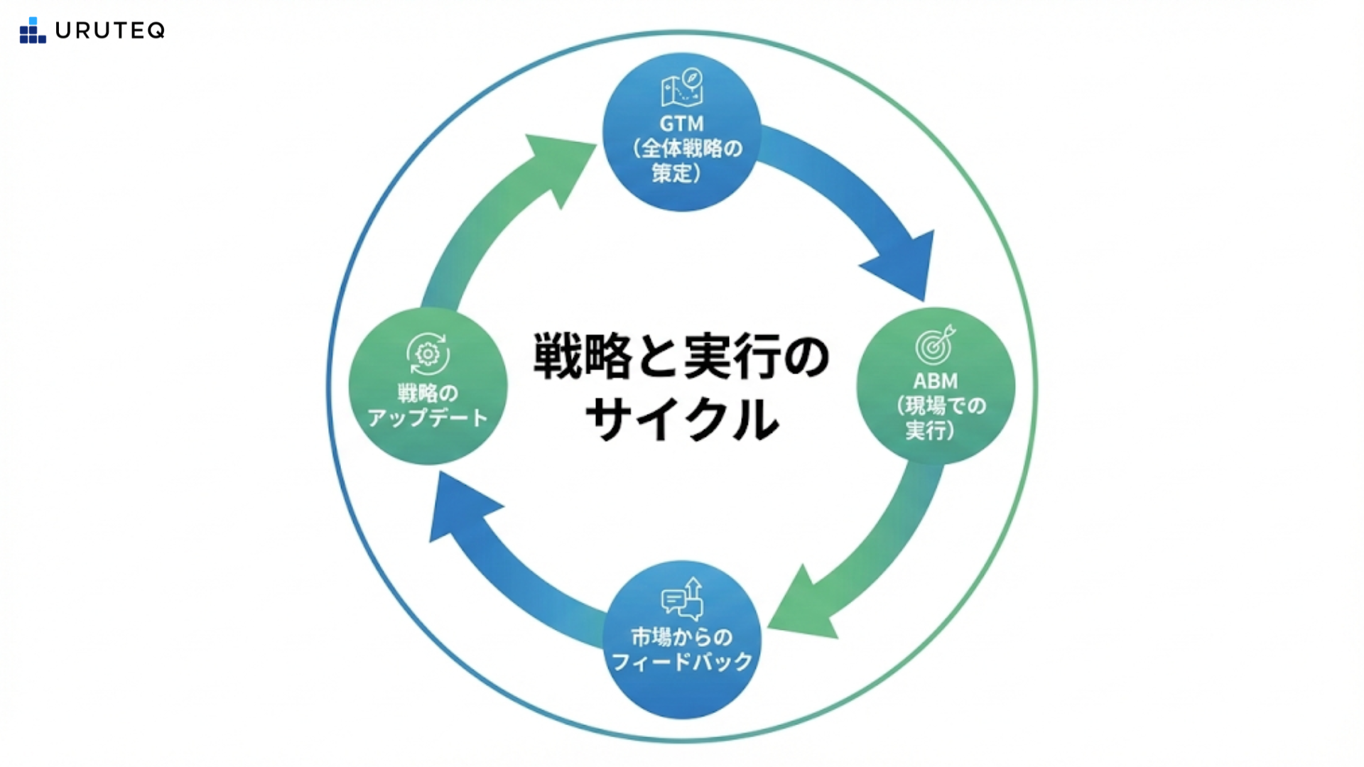 この気づきを、GTM(全体戦略)にフィードバックします。「ターゲットセグメントを少し修正しよう」「提供価値のメッセージを変えよう」といった具合に、戦略自体をアップデートしていくのです。ABMは、市場の最前線で得られる高解像度な情報を、全体戦略に還流させるためのセンサーのような役割も果たします。